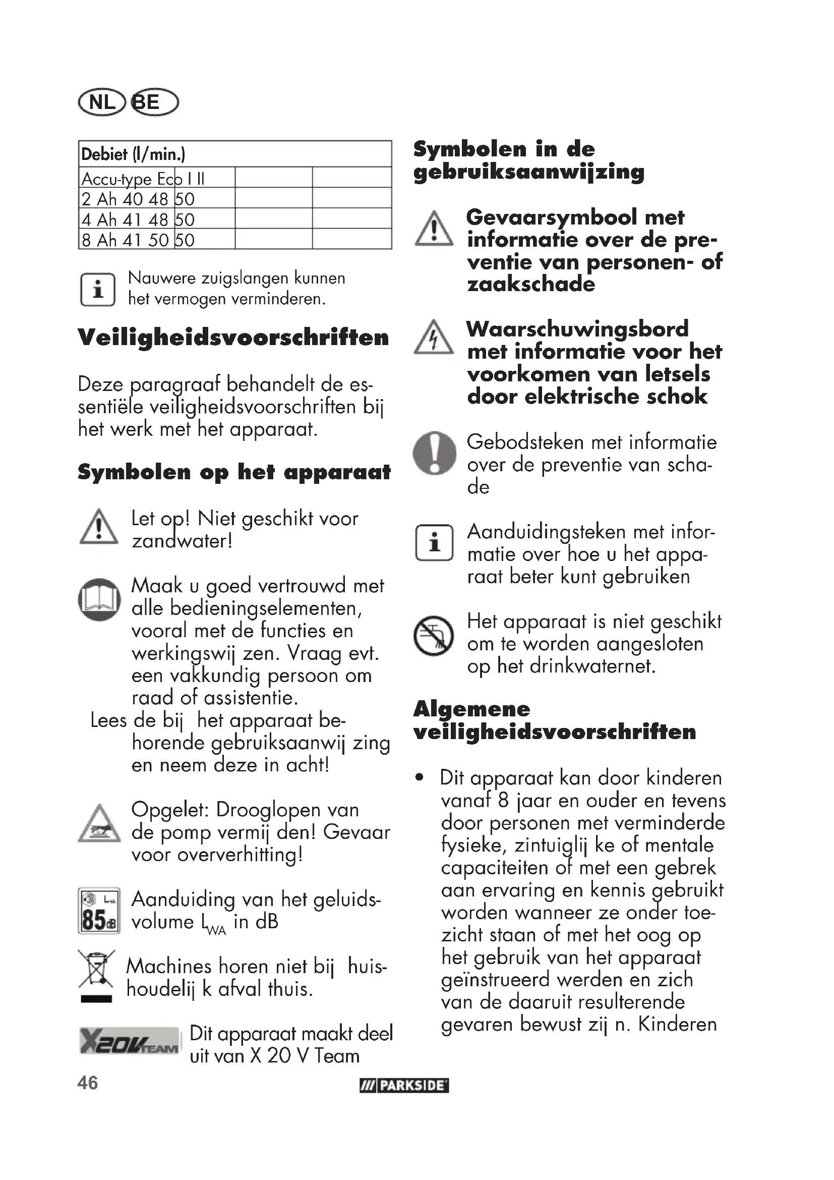 Debiet (l/min.) Accu-type Eco I II 2 Ah 40 48 50 4 Ah 41 48 50 8 Ah 41 50 50 Nauwere zuigslangen kunnen het vermogen verminderen. Veiligheidsvoorschriften Deze paragraaf behandelt de es- sentiële veiligheidsvoorschriften bij het werk met het apparaat. Symbolen op het apparaat Let op! Niet geschikt voor zandwater! Maak u goed vertrouwd met alle bedieningselementen, vooral met de functies en werkingswij zen. Vraag evt. een vakkundig persoon om raad of assistentie. Lees de bij het apparaat be- horende gebruiksaanwij zing en neem deze in acht! Opgelet: Drooglopen van de pomp vermij den! Gevaar voor oververhitting! Aanduiding van het geluids- volume L
