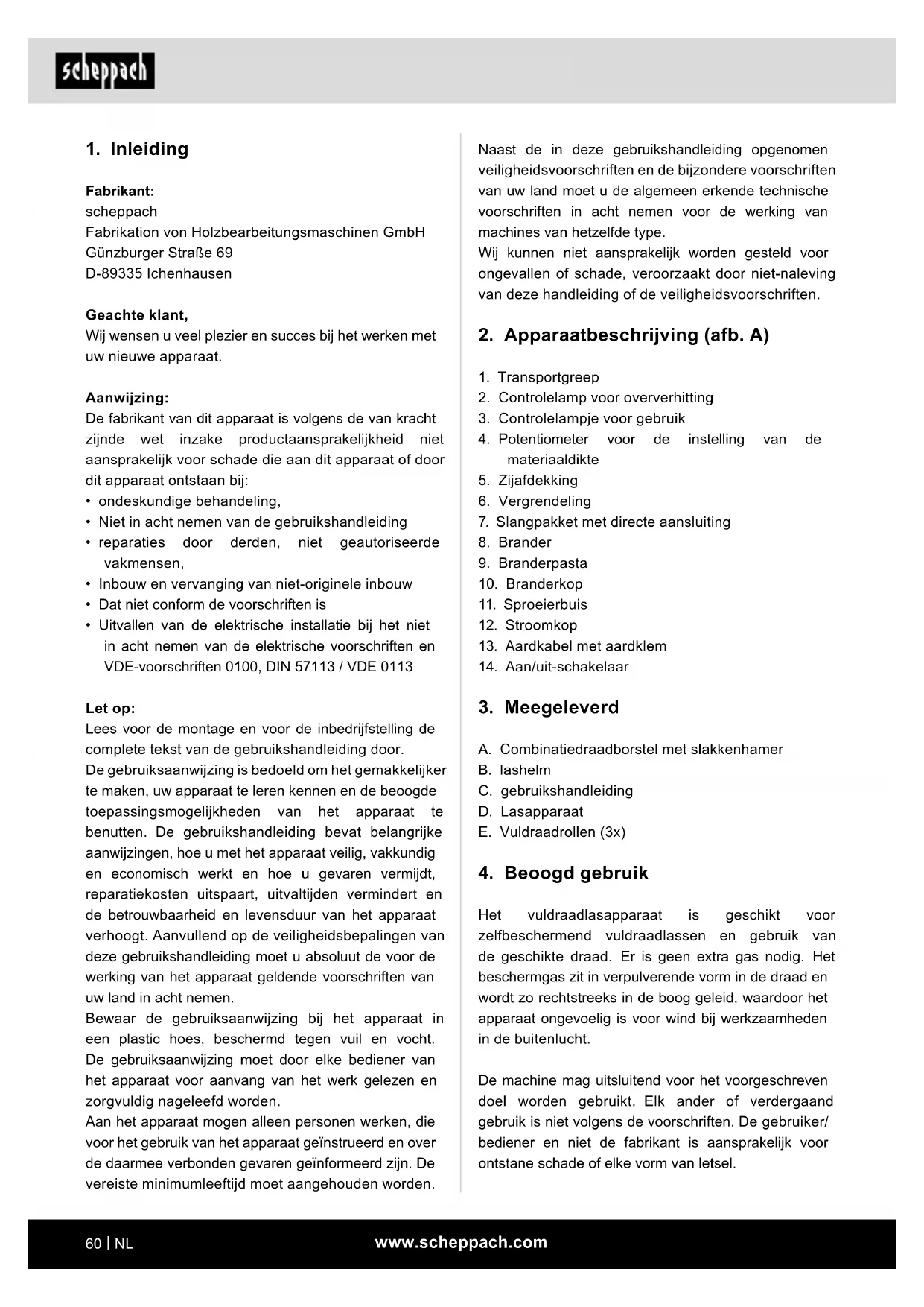 Isolatieklasse Voorzichtig! Gevaar op een elektrische schok! Inademing van lasrook kan uw gezondheid in gevaar brengen. Elektromagnetische velden kunnen de werking van pacemakers verstoren. Lasvonken kunnen een explosie of brand veroorzaken. Vlamboogstralen kunnen de ogen beschadigen en de huid verwonden. Gebruik het apparaat niet buitenshuis en gebruik het nooit in de regen! Afgedankte apparatuur mogen niet bij het huisvuil. Het product voldoet aan de geldende EU-bepalingen. m Let op! In deze gebruikshandleiding hebben wij punten die uw veiligheid betreen van dit teken voorzienwww.scheppach.com