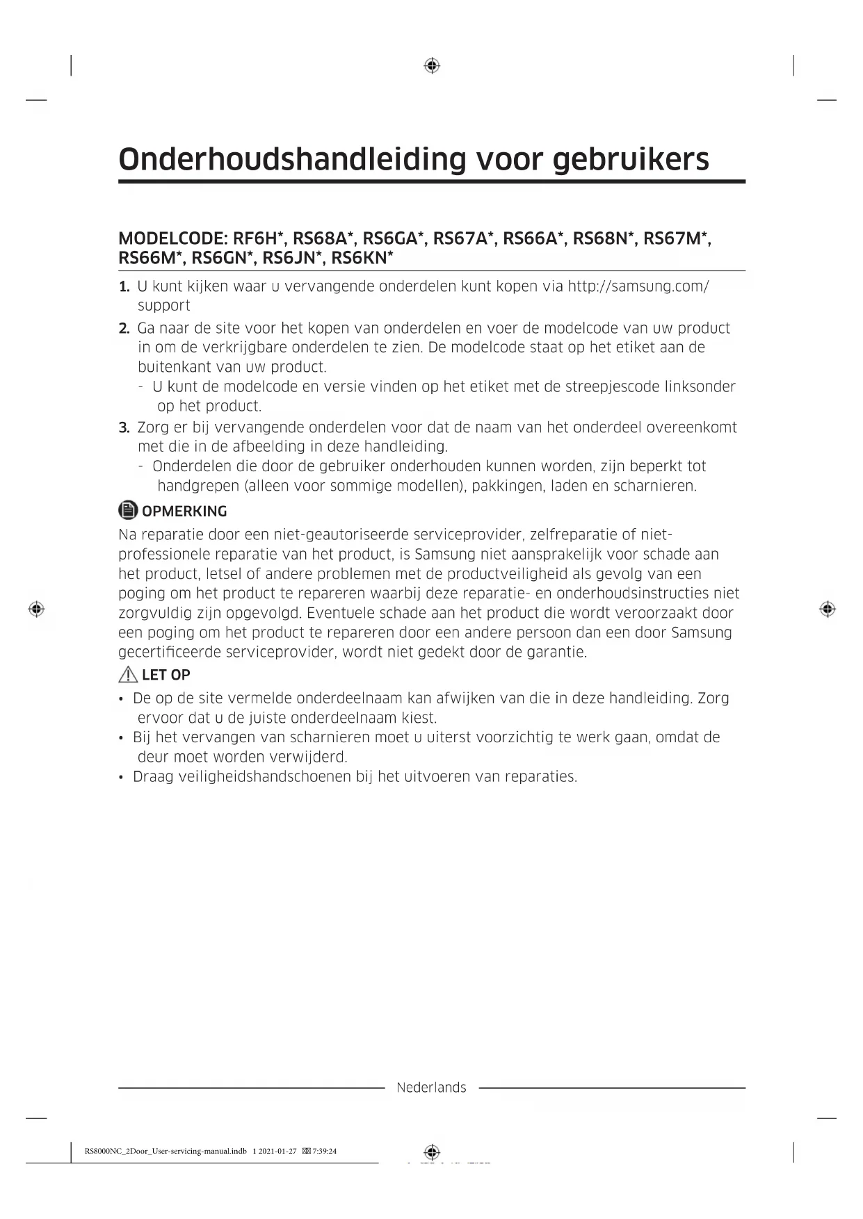 - Draag veiligheidshandschoenen bij het uitvoeren van reparaties. RS8000NC_2Door_User-servicing-manual.indb 1 2021-01-27 7:39:24Nederlands Het werkelijke uiterlijk en de meegeleverde onderdelen van uw koelkast kunnen afwijken, afhankelijk van het model en het land.
