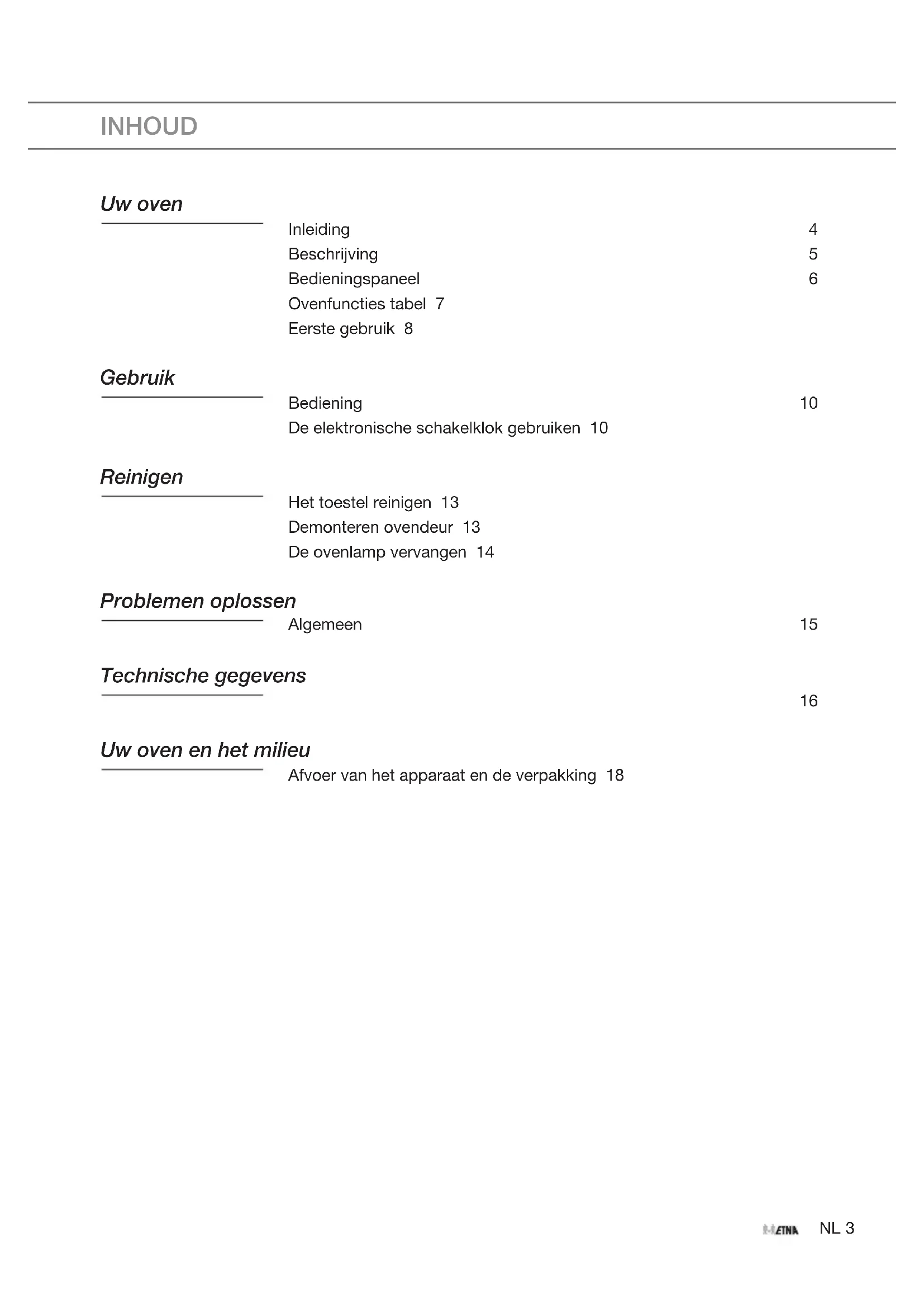 OVEN FOUR OFEN OVEN OM272ZTNL Gebruiksaanwijzing NL 3 - NL 18 FR Mode d’emploi FR 3 - FR 18 DE Bedienungsanleitung DE 3 - DE 18 EN Instructions for use EN 3 - EN 18 Gebruikte pictogrammen - Pictogrammes utilisés - Benutzte Piktogramme Pictograms used Belangrijk om te weten - Important à savoir - Wissenswertes - Important information Tip - Conseil - TippNL 3 INHOUD Uw oven Inleiding 4 Beschrijving 5 Bedieningspaneel 6 Ovenfuncties tabel 7 Eerste gebruik 8 Gebruik Bediening 10 De elektronische schakelklok gebruiken 10 Reinigen Het toestel reinigen 13 Demonteren ovendeur 13 De ovenlamp vervangen 14 Problemen oplossen Algemeen 15 Technische gegevens
