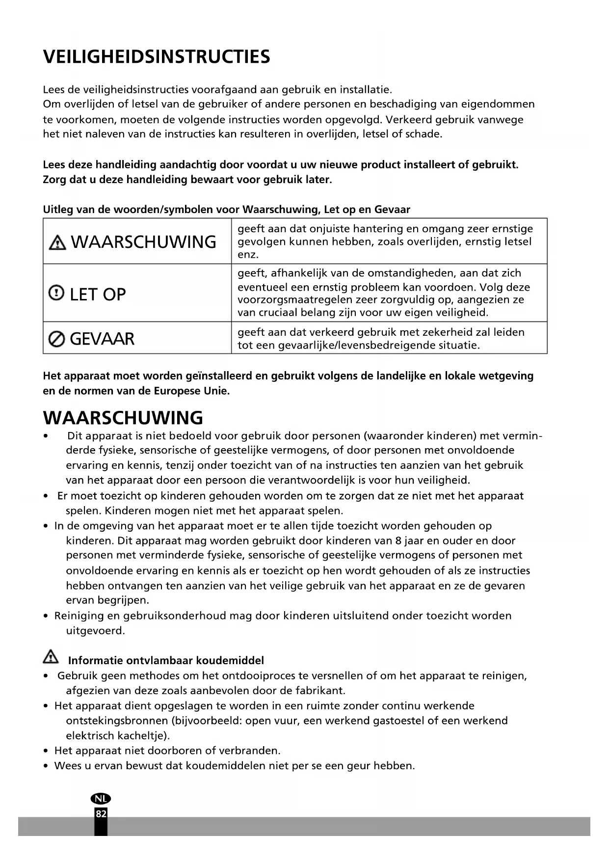 VEILIGHEIDSINSTRUCTIES Lees de veiligheidsinstructies voorafgaand aan gebruik en installatie. Om overlden of letsel van de gebruiker of andere personen en beschadiging van eigendommen te voorkomen, moeten de volgende instructies worden opgevolgd. Verkeerd gebruik vanwege het niet naleven van de instructies kan resulteren in overlden, letsel of schade. Lees deze handleiding aandachtig door voordat u uw nieuwe product installeert of gebruikt. Zorg dat u deze handleiding bewaart voor gebruik later. Uitleg van de woorden/symbolen voor Waarschuwing, Let op en Gevaar WAARSCHUWING geeft aan dat onjuiste hantering en omgang zeer ernstige gevolgen kunnen hebben, zoals overlden, ernstig letsel enz. LETOP geeft, afhankelk van de omstandigheden, aan dat zich eventueel een ernstig probleem kan voordoen. Volg deze voorzorgsmaatregelen zeer zorgvuldig op, aangezien ze van cruciaal belang zn voor uw eigen veiligheid. GEVAAR geeft aan dat verkeerd gebruik met zekerheid zal leiden tot een gevaarlke/levensbedreigende situatie. Het apparaat moet worden geïnstalleerd en gebruikt volgens de landelke en lokale wetgeving en de normen van de Europese Unie. WAARSCHUWING