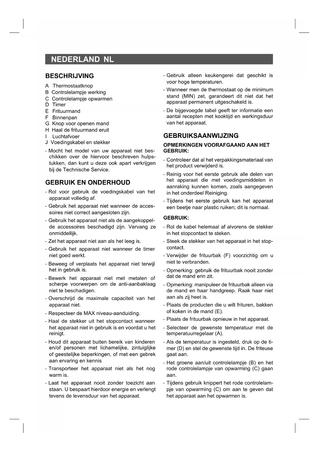 - OPMERKING: Houd er rekening mee dat deze instellingen slechts richtwaarden zijn. De in- grediënten kunnen verschillen van oorsprong, formaat, vorm, en handelsmerk, zodat we niet kunnen garanderen dat deze instellingen opti- maal zijn voor specieke ingrediënten.NL Hoeveelheid (g) Tijd (min) Temperatuur (ºC) Mengen Andere informatie Aardappelen Ingevroren fijne patat friet 300-700 9-16 200 Mengen Ingevroren grove patat friet 300-700 11-20 200 Mengen Zelfgemaakte patat friet (8x8 mm) 300-800 16-20 200 Mengen ½ eetlepel olie toevoegen Zelfgemaakte aardappelpartjes 300-800 18-22 180 Mengen ½ eetlepel olie toevoegen Zelfgemaakte aardappelblokjes 300-750 12-18 180 Mengen ½ eetlepel olie toevoegen Roti 250 15-18 180 Mengen Gegratineerde aardappelen 500 15-18 200 Mengen Vlees en kip Biefstuk 100-500 8-12 180 Varkenskotelet 100-500 10-14 180 Hamburger 100-500 7-14 180 Worstrollen 100-500 13-15 180 Drumsticks 100-500 18-22 180 Kippenborst 100-500 10-15 180 Snacks Loempia's 100-400 8-10 200 Mengen Geschikt voor de oven Ingevroren kipnuggets 100-500 6-10 200 Mengen Geschikt voor de oven Ingevroren vissticks 100-400 6-10 200 Geschikt voor de oven Ingevroren gepaneerde kaassticks 100-400 8-10 180 Geschikt voor de oven Gevulde groenten 100-400 10 160 Bereid in de oven Gebruik een ovenschotel Gebak 300 20-25 160 Gebruik een ovenschotel/ ovenbord Quiche 400 20-22 180 Gebruik een ovenschotel Muffins 300 15-18 200 Gebruik een ovenschotel/ ovenbordNL Probleema Mogelijke oorzaak Oplossing De AIR FRYER werkt niet. De stekker van het apparaat zit niet in het stopcontact. Steek de stekker in een stopcontact met randaarde. De timer is niet ingesteld. Zet het apparaat aan door de timer naar de gewenste kooktijd te draaien. De in de AIR FRYER gefrituurde producten zijn niet helemaal gaar. Men heeft teveel producten in de mand geplaatst. Plaats minder producten in de mand. Wanneer de mand minder vol is kunnen de producten beter opgeschud en uniform gefrituurd worden. De ingestelde temperatuur is te laag. Zet de thermostaatknop in de gewenste stand. Regel de temperatuur bij: zie kooksuggesties. De producten worden ongelijkmatig gefrituurd. Bepaalde producten moeten halverwege opgeschud worden. Wanneer de producten op elkaar liggen (bijvoorbeeld, patat friet), moeten ze halverwege opgeschud worden. De gefrituurde producten zijn niet knapperig. Men heeft ongeschikte producten gebruikt. Raadpleeg de instructies voor bereiding van de fabrikant. De bak/mand kan niet bewogen worden in het apparaat. De mand is te vol geladen. Vul de mand niet hoger dan het MAX niveau. De mand is niet correct in de bak geplaatst. Druk de mand in de bak totdat u een klik hoort Er komt witte rook uit het apparaat. De producten hebben een hoog oliegehalte. Men heeft olie toegevoegd. Gebruik geen producten met een hoog oliegehalte en voeg niet meer olie toe dan strikt noodzakelijk. Deze friteuse werkt met een techniek die geen of weinig olie vereist. De bak bevat nog vetresten van de vorige keer. De witte rook wordt veroorzaakt door verhitte olie in de bak.ČESKY CS POPIS A Termostat B Provozní kontrolka C Kontrolka ohřevu D Časovač E Fritovací koš F Vnější nádoba G Tlačítko pro uvolnění koše H Rukojeť koše I Odvod vzduchu J Napájecí kabel a zástrčka