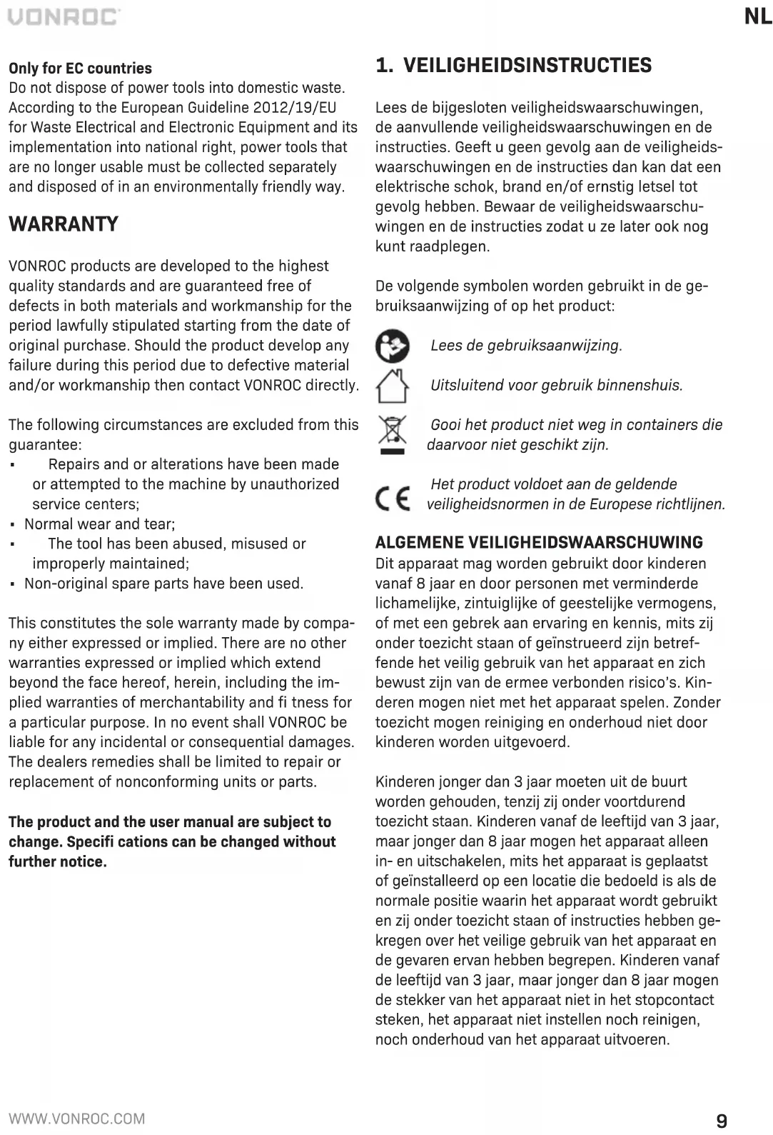 die verder strekken dan deze garantie, inclusief de impliciete garanties inzake de verkoopbaarheid en geschiktheid voor een specifi ek doel. In geen geval zal VONROC aansprakelijk zijn voor inciden- tele schade of gevolgschade. De oplossingen van de dealers zullen beperkt zijn tot de reparatie of het vervangen van niet-conforme eenheden of onderdelen. Het product en de gebruiksaanwijzing kunnen worden gewijzigd. Specifi caties kunnen zonder voorafgaande kennisgeving worden gewijzigd.