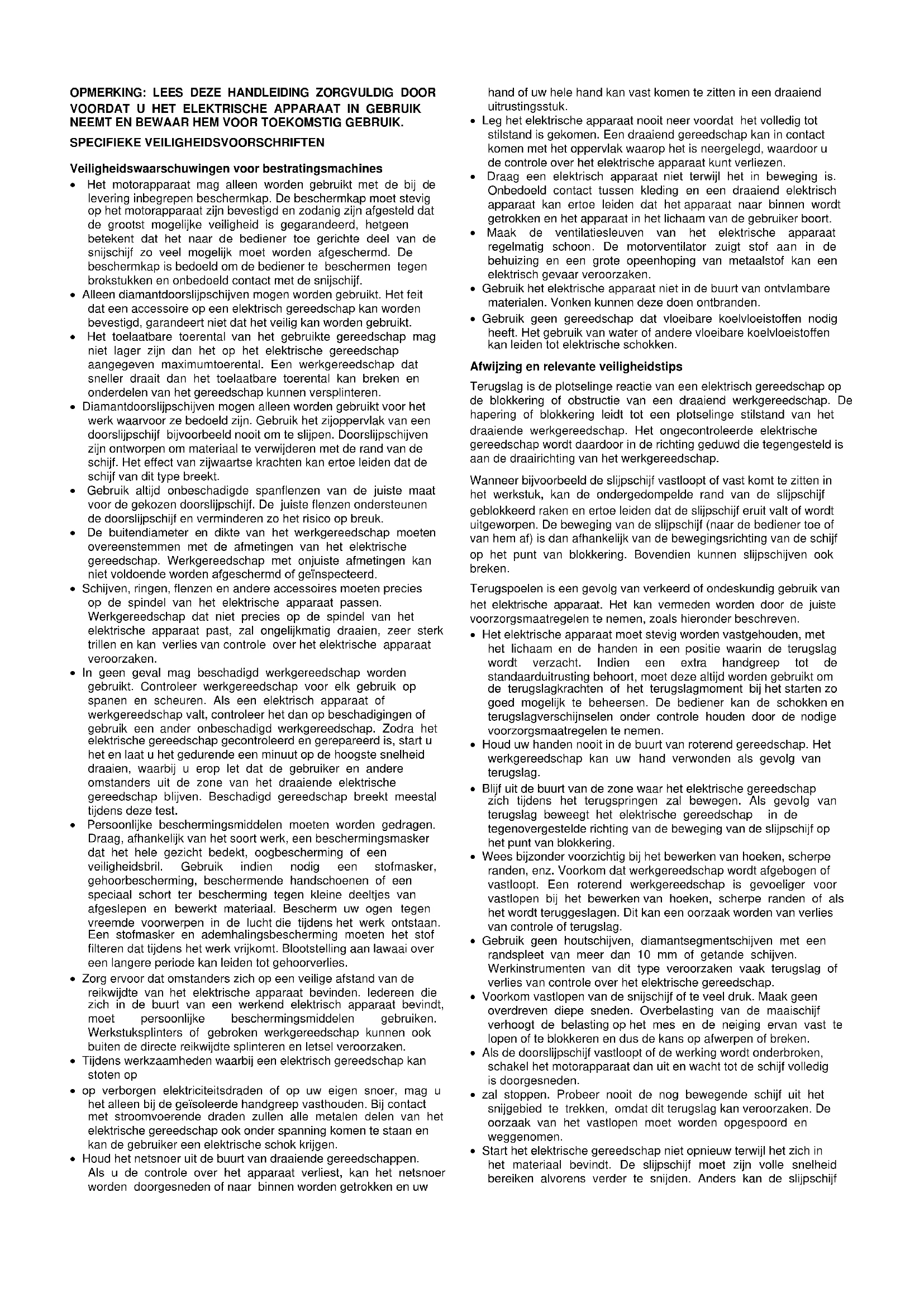 - Diamantdoorslijpschijven mogen alleen worden gebruikt voor het werk waarvoor ze bedoeld zijn. Gebruik het zijoppervlak van een doorslijpschijf bijvoorbeeld nooit om te slijpen. Doorslijpschijven zijn ontworpen om materiaal te verwijderen met de rand van de schijf. Het effect van zijwaartse krachten kan ertoe leiden dat de schijf van dit type breekt.