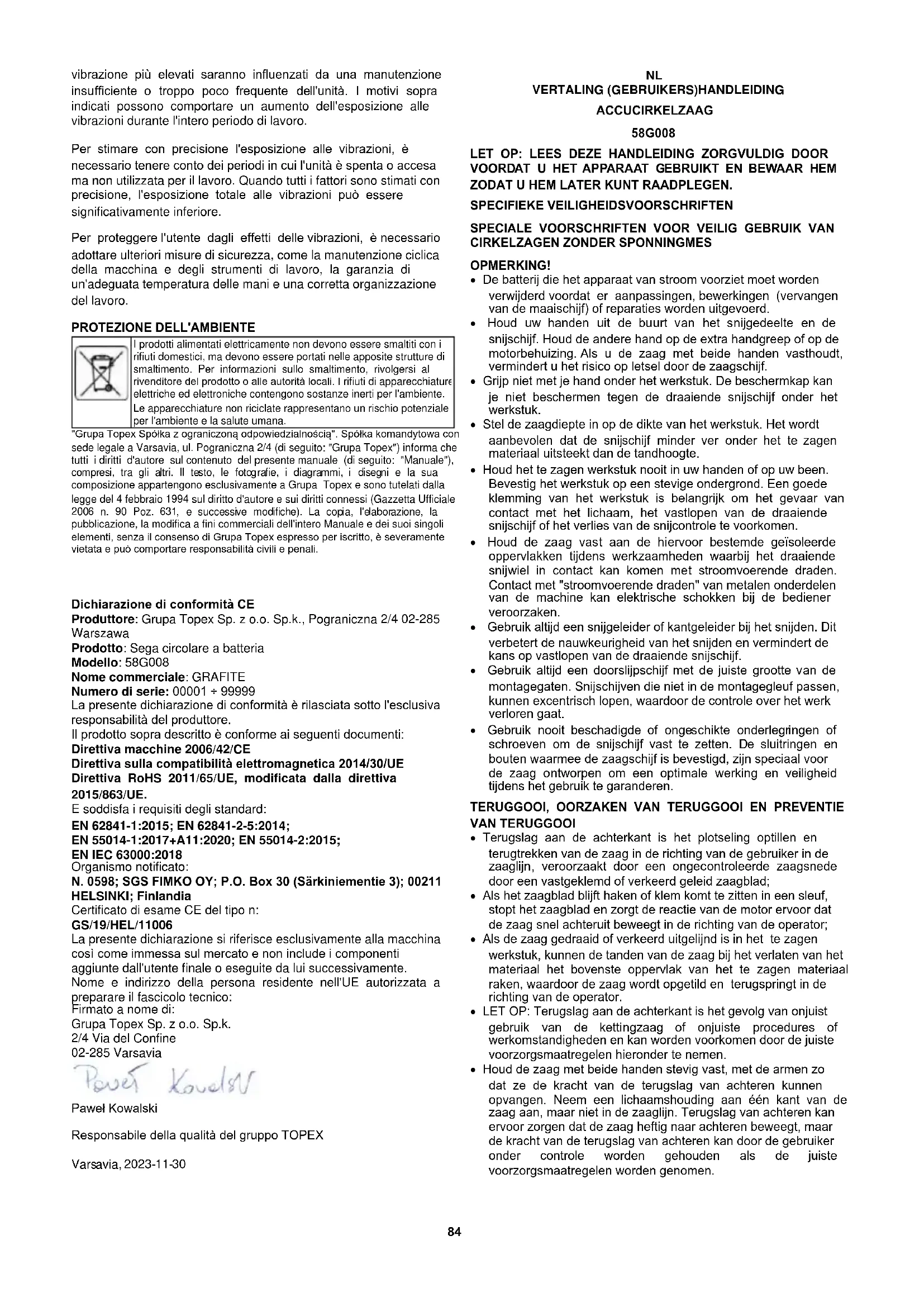 Elektrisch aangedreven producten mogen niet met het huishoudelijk afval worden weggegooid, maar moeten naar de daarvoor bestemde afvalverwerkingsfaciliteiten worden gebracht. Neem contact op met de leverancier van uw product of de lokale overheid voor informatie over afvalverwerking. Afgedankte elektrische en elektronische apparatuur bevat milieu-inerte stoffen. Apparatuur die niet wordt gerecycled, vormt een potentieel risico voor het milieu en de volksgezondheid. "Grupa Topex Spółka z ograniczoną odpowiedzialnością". Spółka komandytowa met maatschappelijke zetel in Warschau, ul. Pograniczna 2/4 (hierna: "Grupa Topex") deelt mee dat alle auteursrechten op de inhoud van deze handleiding (hierna: "Handleiding"), met inbegrip van onder andere. De tekst, foto's, diagrammen, tekeningen en de samenstelling ervan behoren uitsluitend toe aan Grupa Topex en vallen onder de wettelijke bescherming van de wet van 4 februari 1994 betreffende het auteursrecht en de naburige rechten (Staatsblad 2006 nr. 90 Poz. 631, zoals gewijzigd). Het kopiëren, verwerken, publiceren, wijzigen voor commerciële doeleinden van het gehele Handboek en de afzonderlijke elementen ervan, zonder de schriftelijke toestemming van Grupa Topex, is ten strengste verboden en kan leiden tot civiele en strafrechtelijke aansprakelijkheid. EG-verklaring van overeenstemming Fabrikant: Grupa Topex Sp. z o.o. Sp.k., Pograniczna 2/4 02-285 Warszawa Product: Draadloze cirkelzaag Model: 58G008 Handelsnaam: GRAPHITE Serienummer: 00001 ÷ 99999 Deze conformiteitsverklaring wordt afgegeven onder volledige verantwoordelijkheid van de fabrikant. Het hierboven beschreven product voldoet aan de volgende documenten: Machinerichtlijn 2006/42/EG Richtlijn elektromagnetische compatibiliteit 2014/30/EU RoHS-richtlijn 2011/65/EU zoals gewijzigd door Richtlijn 2015/863/EU En voldoet aan de eisen van de normen: EN 62841-1:2015; EN 62841-2-5:2014; EN 55014-1:2017+A11:2020; EN 55014-2:2015; EN IEC 63000:2018 Aangemelde instantie: Nr. 0598; SGS FIMKO OY; P.O. Box 30 (Särkiniementie 3); 00211 HELSINKI; Finland EG-typeonderzoekscertificaat nr: GS/19/HEL/11006 Deze verklaring heeft alleen betrekking op de machine zoals die in de handel wordt gebracht en niet op componenten toegevoegd door de eindgebruiker of later door hem/haar uitgevoerd. Naam en adres van de in de EU woonachtige persoon die gemachtigd is om het technisch dossier voor te bereiden: Ondertekend namens: Grupa Topex Sp. z o.o. Sp.k. 2/4 Grensstraat 02-285 Warschau Paweł Kowalski Kwaliteitsmedewerker TOPEX GROEP Warschau, 2023-11-30