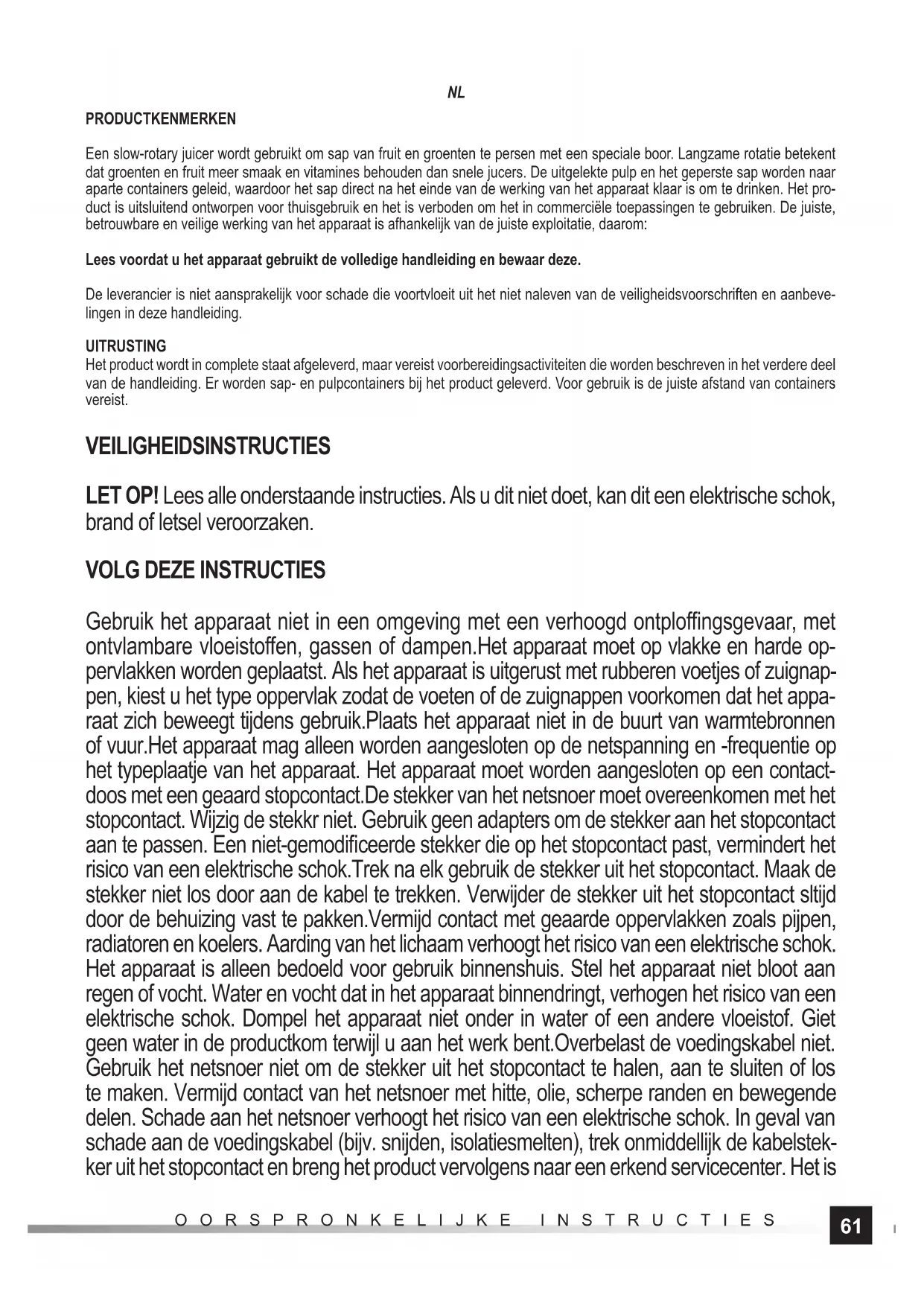 PRODUCTKENMERKEN Een slow-rotary juicer wordt gebruikt om sap van fruit en groenten te persen met een speciale boor. Langzame rotatie betekent dat groenten en fruit meer smaak en vitamines behouden dan snele jucers. De uitgelekte pulp en het geperste sap worden naar aparte containers geleid, waardoor het sap direct na het einde van de werking van het apparaat klaar is om te drinken. Het pro- duct is uitsluitend ontworpen voor thuisgebruik en het is verboden om het in commerciële toepassingen te gebruiken. De juiste, betrouwbare en veilige werking van het apparaat is afhankelijk van de juiste exploitatie, daarom: Lees voordat u het apparaat gebruikt de volledige handleiding en bewaar deze. De leverancier is niet aansprakelijk voor schade die voortvloeit uit het niet naleven van de veiligheidsvoorschriften en aanbeve- lingen in deze handleiding. UITRUSTING Het product wordt in complete staat afgeleverd, maar vereist voorbereidingsactiviteiten die worden beschreven in het verdere deel van de handleiding. Er worden sap- en pulpcontainers bij het product geleverd. Voor gebruik is de juiste afstand van containers vereist. VEILIGHEIDSINSTRUCTIES LET OP! Lees alle onderstaande instructies. Als u dit niet doet, kan dit een elektrische schok, brand of letsel veroorzaken.