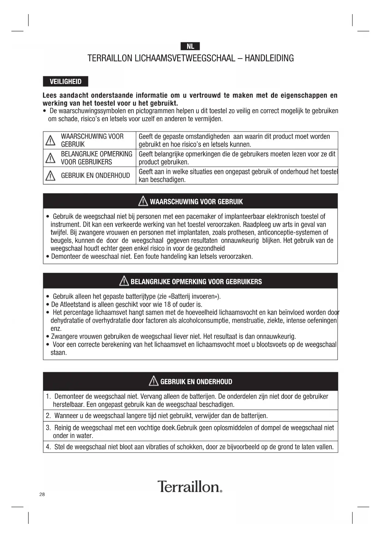 - Gebruik de weegschaal niet bij personen met een pacemaker of implanteerbaar elektronisch toestel of instrument. Dit kan een verkeerde werking van het toestel veroorzaken. Raadpleeg uw arts in geval van twijfel. Bij zwangere vrouwen en personen met implantaten, zoals prothesen, anticonceptie-systemen of beugels, kunnen de door de weegschaal gegeven resultaten onnauwkeurig blijken. Het gebruik van de weegschaal houdt echter geen enkel risico in voor de gezondheid