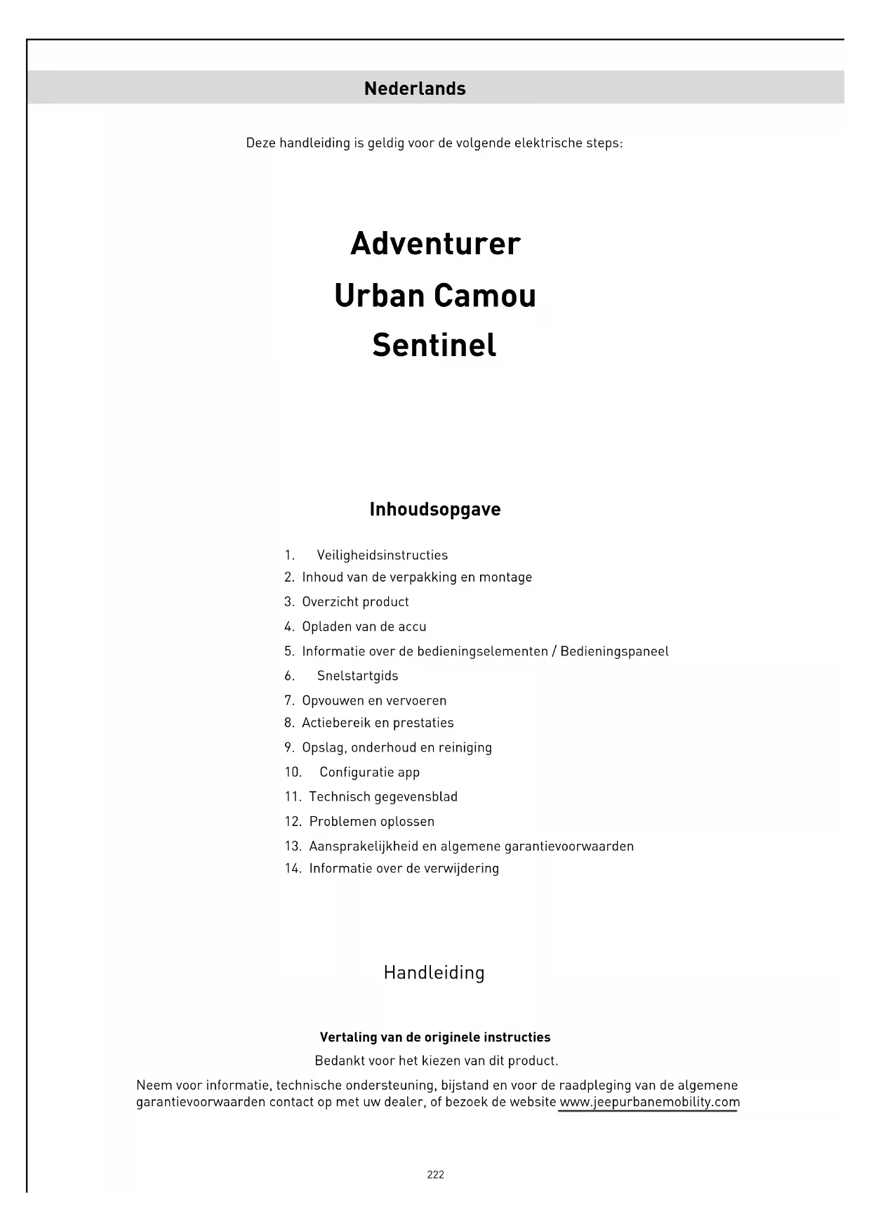 Met het oog op de voortdurende technologische ontwikkeling behoudt de fabrikant zich het recht voor om het product zonder voorafgaande kennisgeving bij te werken, zonder dat deze handleiding automatisch wordt bijgewerkt. Ga voor informatie en de herzieningen van deze handleiding naar de website www.jeepurbanemobility.com Adventurer / Urban Camou Gasbediening Schijfrem Sluithaak Schakelaar richtingaanwijzers Remhendel Display Sluithaak Voetplaat Standaard Geveerde achtervork Chassis Veiligheidsmechanisme Sluitingsmechanisme Motor en elektronische rem Geveerde voorvork230 Sentinel Sluithaak Achterspatbord Schakelaar richtingaanwijzers Remhendel Voetplaat Standaard Schijfrem Achterlicht Oplaadaansluiting Veiligheidsmechanisme Sluitingsmechanisme Motor en elektronische rem Gasbediening Voorlicht Sluithaak Display Geveerde voorvork231 Achterlicht OPGELET Voorafgaand aan het eerste gebruik moet de accu naar 100% worden opgeladen. Zorg ervoor dat het product, de acculader en de oplaadaansluiting droog zijn. Aanwijzingen