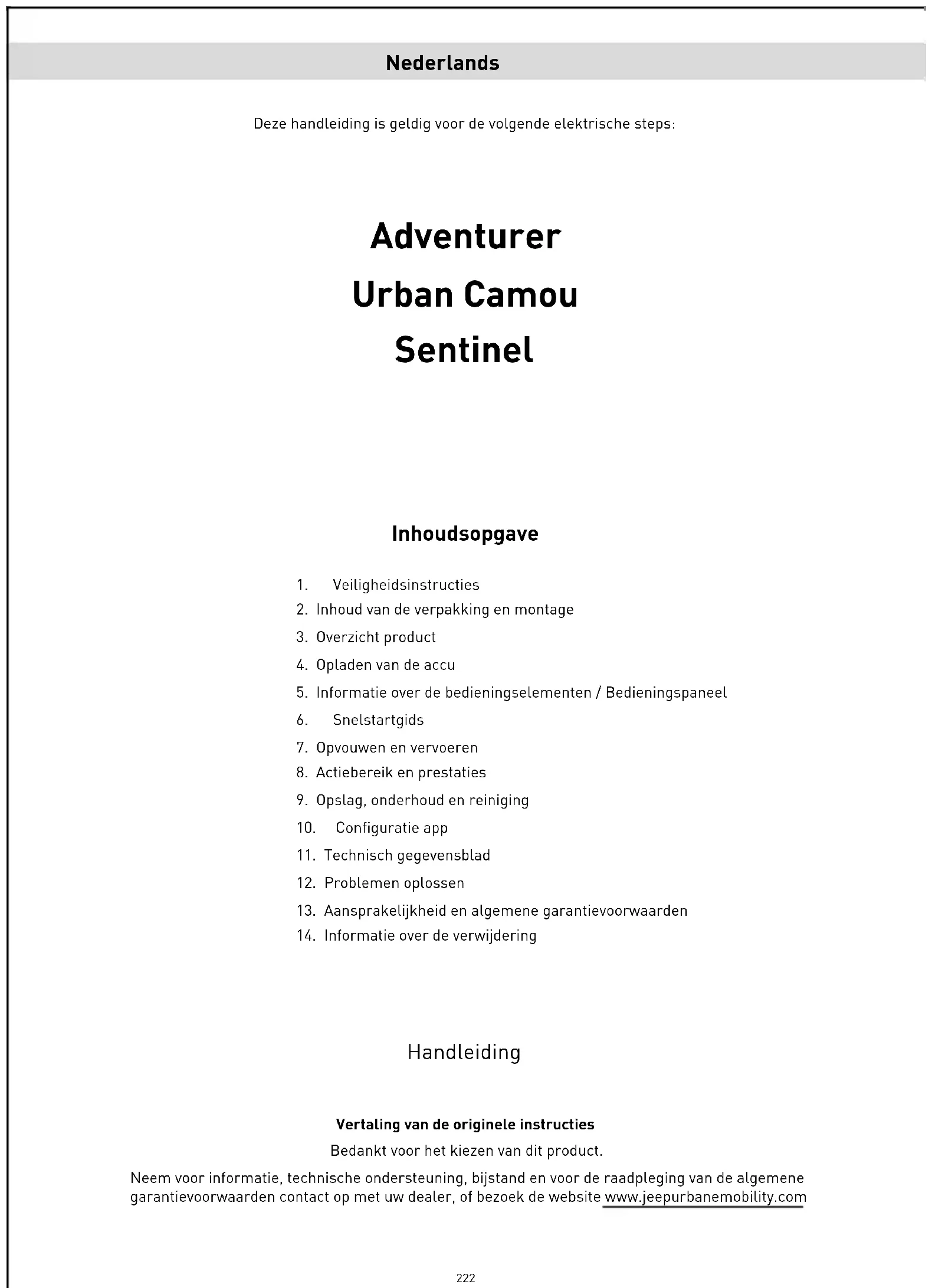 Met het oog op de voortdurende technologische ontwikkeling behoudt de fabrikant zich het recht voor om het product zonder voorafgaande kennisgeving bij te werken, zonder dat deze handleiding automatisch wordt bijgewerkt. Ga voor informatie en de herzieningen van deze handleiding naar de website www.jeepurbanemobility.com Adventurer / Urban Camou Gasbediening Schijfrem Sluithaak Schakelaar richtingaanwijzers Remhendel Display Sluithaak Voetplaat Standaard Geveerde achtervork Chassis Veiligheidsmechanisme Sluitingsmechanisme Motor en elektronische rem Geveerde voorvork230 Sentinel Sluithaak Achterspatbord Schakelaar richtingaanwijzers Remhendel Voetplaat Standaard Schijfrem Achterlicht Oplaadaansluiting Veiligheidsmechanisme Sluitingsmechanisme Motor en elektronische rem Gasbediening Voorlicht Sluithaak Display Geveerde voorvork231 Achterlicht OPGELET Voorafgaand aan het eerste gebruik moet de accu naar 100% worden opgeladen. Zorg ervoor dat het product, de acculader en de oplaadaansluiting droog zijn. Aanwijzingen