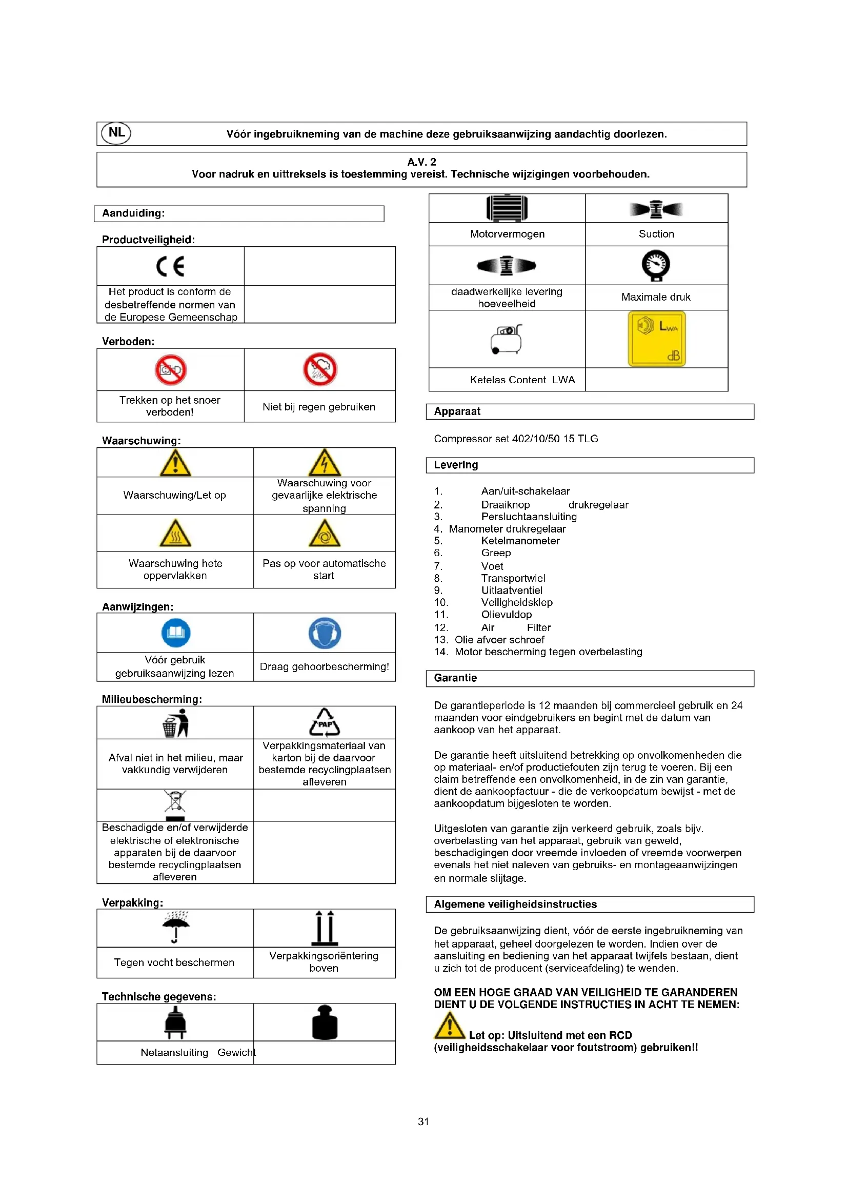 De garantieperiode is 12 maanden bij commercieel gebruik en 24 maanden voor eindgebruikers en begint met de datum van aankoop van het apparaat. De garantie heeft uitsluitend betrekking op onvolkomenheden die op materiaal- en/of productiefouten zijn terug te voeren. Bij een claim betreffende een onvolkomenheid, in de zin van garantie, dient de aankoopfactuur - die de verkoopdatum bewijst - met de aankoopdatum bijgesloten te worden. Uitgesloten van garantie zijn verkeerd gebruik, zoals bijv. overbelasting van het apparaat, gebruik van geweld, beschadigingen door vreemde invloeden of vreemde voorwerpen evenals het niet naleven van gebruiks- en montageaanwijzingen en normale slijtage. Algemene veiligheidsinstructies De gebruiksaanwijzing dient, vóór de eerste ingebruikneming van het apparaat, geheel doorgelezen te worden. Indien over de aansluiting en bediening van het apparaat twijfels bestaan, dient u zich tot de producent (serviceafdeling) te wenden. OM EEN HOGE GRAAD VAN VEILIGHEID TE GARANDEREN DIENT U DE VOLGENDE INSTRUCTIES IN ACHT TE NEMEN: Let op: Uitsluitend met een RCD (veiligheidsschakelaar voor foutstroom) gebruiken!!
