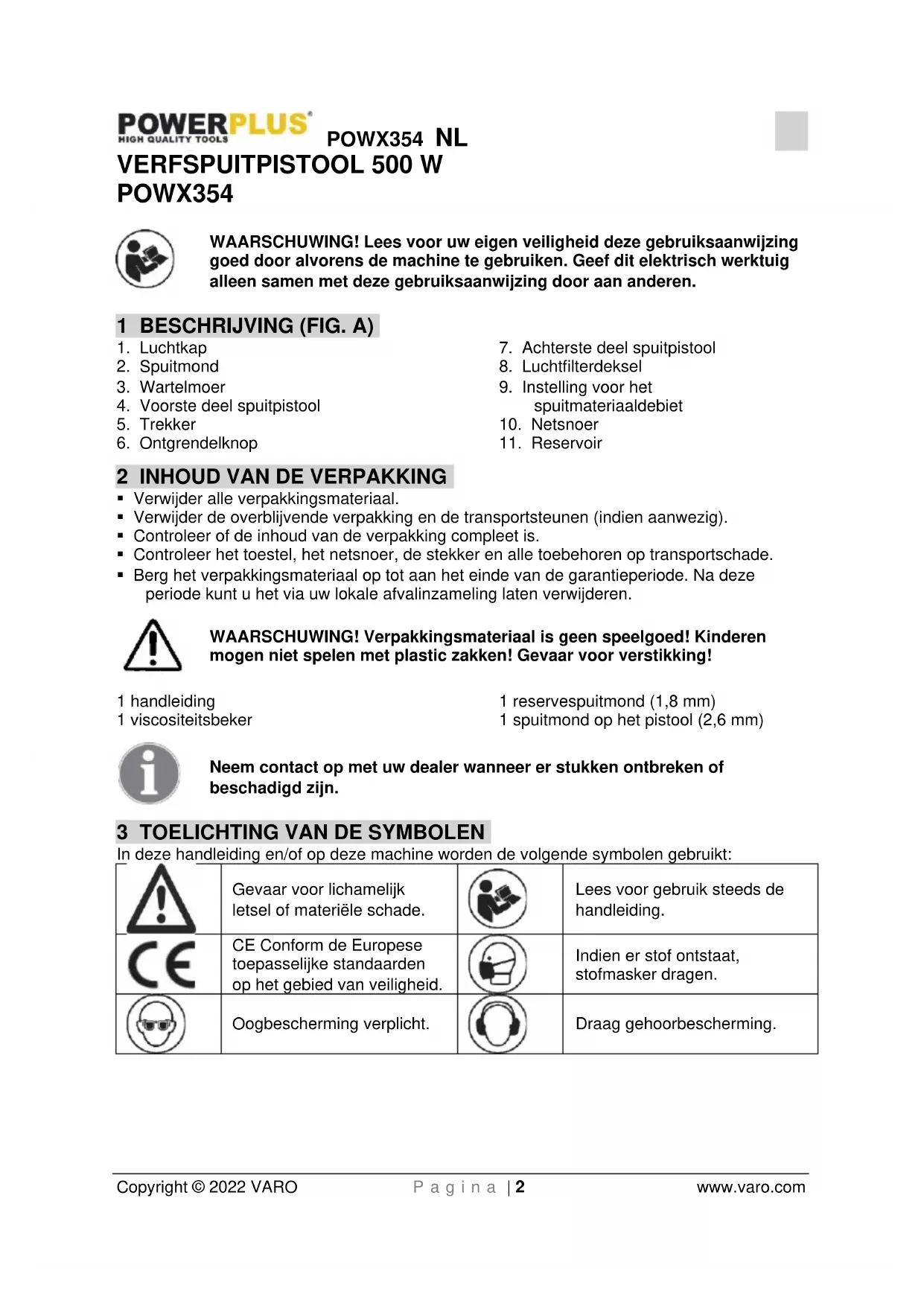 - NIET SPUITEN - niet spuiten in omgevingen, waarvan de gevaren niet bekend zijn.POWX354 NL Copyright © 2022 VARO P a g i n a | 5 www.varo.com