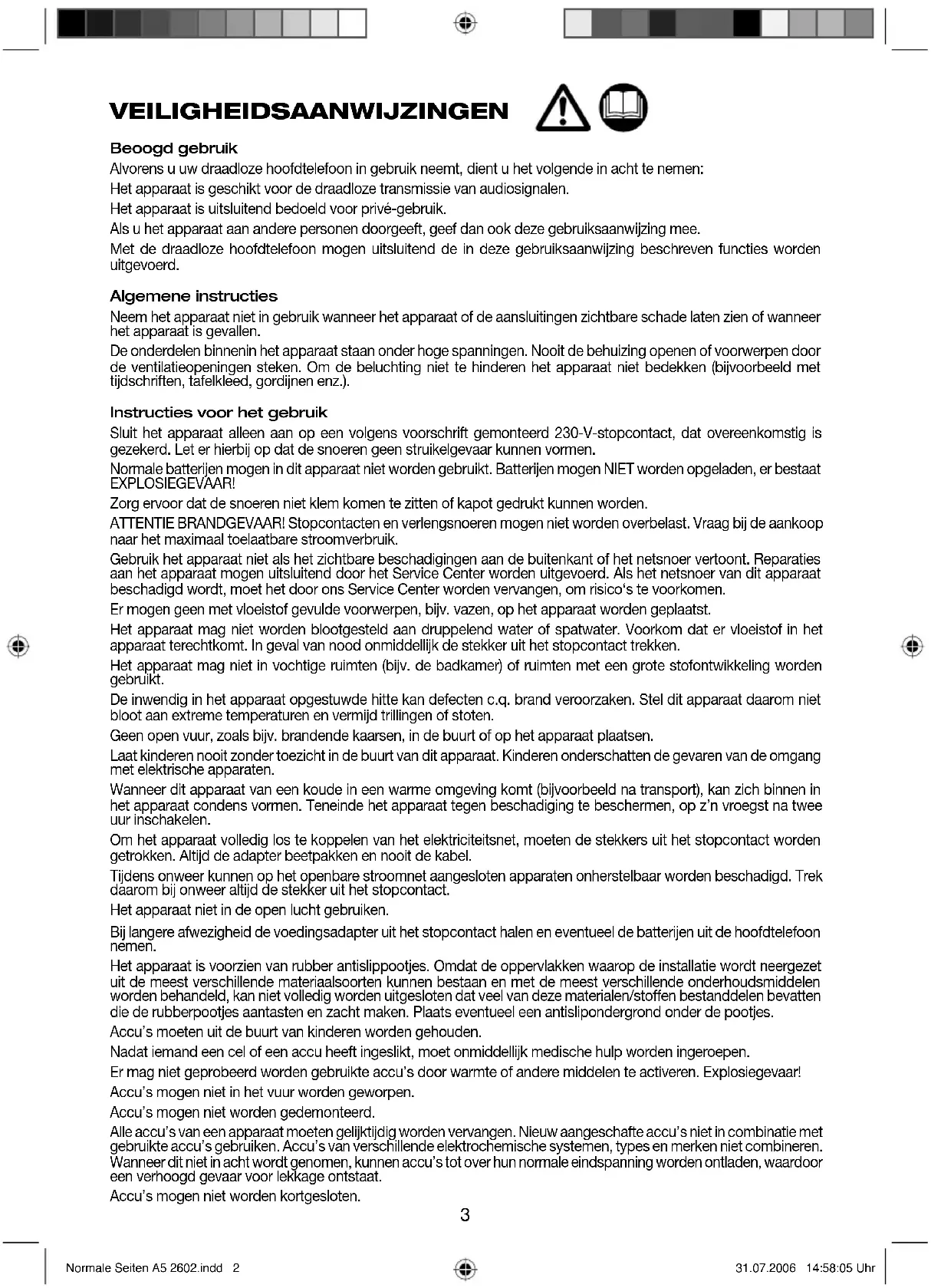 - GARANTIEVOORWAARDEN GARANTIEKAART Normale Seiten A5 2602.indd 1Normale Seiten A5 2602.indd 1 31.07.2006 14:58:05 Uhr31.07.2006 14:58:05 Uhr3 VEILIGHEIDSAANWIJZINGEN Beoogd gebruik Alvorens u uw draadloze hoofdtelefoon in gebruik neemt, dient u het volgende in acht te nemen: Het apparaat is geschikt voor de draadloze transmissie van audiosignalen. Het apparaat is uitsluitend bedoeld voor privé-gebruik. Als u het apparaat aan andere personen doorgeeft, geef dan ook deze gebruiksaanwijzing mee. Met de draadloze hoofdtelefoon mogen uitsluitend de in deze gebruiksaanwijzing beschreven functies worden uitgevoerd. Algemene instructies Neem het apparaat niet in gebruik wanneer het apparaat of de aansluitingen zichtbare schade laten zien of wanneer het apparaat is gevallen. De onderdelen binnenin het apparaat staan onder hoge spanningen. Nooit de behuizing openen of voorwerpen door de ventilatieopeningen steken. Om de beluchting niet te hinderen het apparaat niet bedekken (bijvoorbeeld met tijdschriften, tafelkleed, gordijnen enz.). Instructies voor het gebruik Sluit het apparaat alleen aan op een volgens voorschrift gemonteerd 230-V-stopcontact, dat overeenkomstig is gezekerd. Let er hierbij op dat de snoeren geen struikelgevaar kunnen vormen. Normale batterijen mogen in dit apparaat niet worden gebruikt. Batterijen mogen NIET worden opgeladen, er bestaat EXPLOSIEGEVAAR! Zorg ervoor dat de snoeren niet klem komen te zitten of kapot gedrukt kunnen worden. ATTENTIE BRANDGEVAAR! Stopcontacten en verlengsnoeren mogen niet worden overbelast. Vraag bij de aankoop naar het maximaal toelaatbare stroomverbruik. Gebruik het apparaat niet als het zichtbare beschadigingen aan de buitenkant of het netsnoer vertoont. Reparaties aan het apparaat mogen uitsluitend door het Service Center worden uitgevoerd. Als het netsnoer van dit apparaat beschadigd wordt, moet het door ons Service Center worden vervangen, om risico‘s te voorkomen. Er mogen geen met vloeistof gevulde voorwerpen, bijv. vazen, op het apparaat worden geplaatst. Het apparaat mag niet worden blootgesteld aan druppelend water of spatwater. Voorkom dat er vloeistof in het apparaat terechtkomt. In geval van nood onmiddellijk de stekker uit het stopcontact trekken. Het apparaat mag niet in vochtige ruimten (bijv. de badkamer) of ruimten met een grote stofontwikkeling worden gebruikt. De inwendig in het apparaat opgestuwde hitte kan defecten c.q. brand veroorzaken. Stel dit apparaat daarom niet bloot aan extreme temperaturen en vermijd trillingen of stoten. Geen open vuur, zoals bijv. brandende kaarsen, in de buurt of op het apparaat plaatsen. Laat kinderen nooit zonder toezicht in de buurt van dit apparaat. Kinderen onderschatten de gevaren van de omgang met elektrische apparaten. Wanneer dit apparaat van een koude in een warme omgeving komt (bijvoorbeeld na transport), kan zich binnen in het apparaat condens vormen. Teneinde het apparaat tegen beschadiging te beschermen, op z’n vroegst na twee uur inschakelen. Om het apparaat volledig los te koppelen van het elektriciteitsnet, moeten de stekkers uit het stopcontact worden getrokken. Altijd de adapter beetpakken en nooit de kabel. Tijdens onweer kunnen op het openbare stroomnet aangesloten apparaten onherstelbaar worden beschadigd. Trek daarom bij onweer altijd de stekker uit het stopcontact. Het apparaat niet in de open lucht gebruiken. Bij langere afwezigheid de voedingsadapter uit het stopcontact halen en eventueel de batterijen uit de hoofdtelefoon nemen. Het apparaat is voorzien van rubber antislippootjes. Omdat de oppervlakken waarop de installatie wordt neergezet uit de meest verschillende materiaalsoorten kunnen bestaan en met de meest verschillende onderhoudsmiddelen worden behandeld, kan niet volledig worden uitgesloten dat veel van deze materialen/stoffen bestanddelen bevatten die de rubberpootjes aantasten en zacht maken. Plaats eventueel een antislipondergrond onder de pootjes. Accu’s moeten uit de buurt van kinderen worden gehouden. Nadat iemand een cel of een accu heeft ingeslikt, moet onmiddellijk medische hulp worden ingeroepen. Er mag niet geprobeerd worden gebruikte accu’s door warmte of andere middelen te activeren. Explosiegevaar! Accu’s mogen niet in het vuur worden geworpen. Accu’s mogen niet worden gedemonteerd. Alle accu’s van een apparaat moeten gelijktijdig worden vervangen. Nieuw aangeschafte accu’s niet in combinatie met gebruikte accu’s gebruiken. Accu’s van verschillende elektrochemische systemen, types en merken niet combineren. Wanneer dit niet in acht wordt genomen, kunnen accu’s tot over hun normale eindspanning worden ontladen, waardoor een verhoogd gevaar voor lekkage ontstaat. Accu’s mogen niet worden kortgesloten. Normale Seiten A5 2602.indd 2Normale Seiten A5 2602.indd 2 31.07.2006 14:58:05 Uhr31.07.2006 14:58:05 Uhr4 p. 8