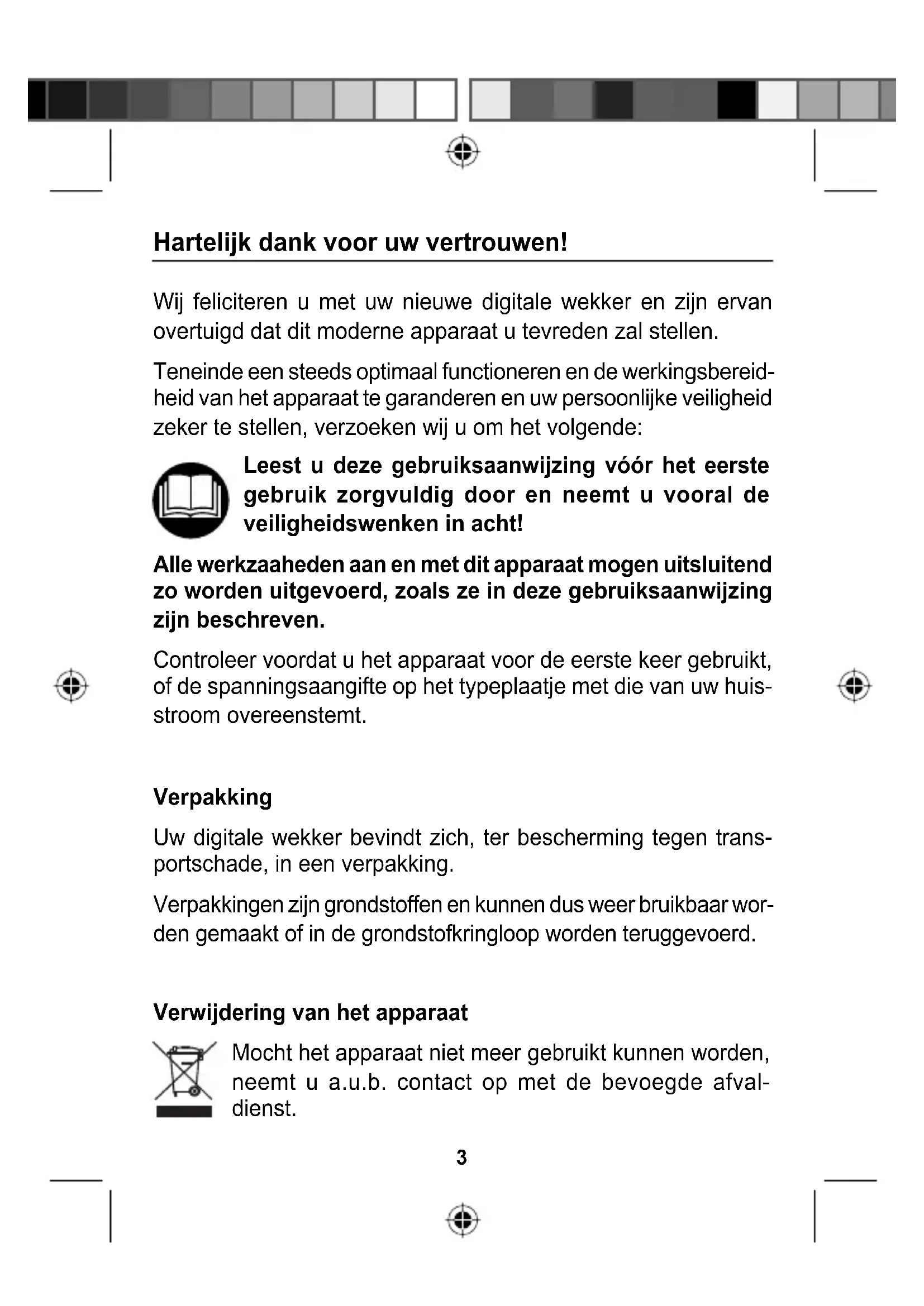 laatste pagina3 Wij feliciteren u met uw nieuwe digitale wekker en zijn ervan overtuigd dat dit moderne apparaat u tevreden zal stellen. Teneinde een steeds optimaal functioneren en de werkingsbereid- heid van het apparaat te garanderen en uw persoonlijke veiligheid zeker te stellen, verzoeken wij u om het volgende: Leest u deze gebruiksaanwijzing vóór het eerste gebruik zorgvuldig door en neemt u vooral de veiligheidswenken in acht! Alle werkzaaheden aan en met dit apparaat mogen uitsluitend zo worden uitgevoerd, zoals ze in deze gebruiksaanwijzing zijn beschreven. Controleer voordat u het apparaat voor de eerste keer gebruikt, of de spanningsaangifte op het typeplaatje met die van uw huis- stroom overeenstemt. Verpakking Uw digitale wekker bevindt zich, ter bescherming tegen trans- portschade, in een verpakking. Verpakkingen zijn grondstoffen en kunnen dus weer bruikbaar wor- den gemaakt of in de grondstofkringloop worden teruggevoerd. Verwijdering van het apparaat Mocht het apparaat niet meer gebruikt kunnen worden, neemt u a.u.b. contact op met de bevoegde afval- dienst. Hartelijk dank voor uw vertrouwen!4 VEILIGHEIDSAANWIJZINGEN Om uw nieuwe apparaat veilig en op betrouwbare wijze te kunnen gebruiken, verzoeken wij u de veiligheidsaanwijzingen en de gebruiksaanwijzing zorgvuldig door te lezen voordat u begint met de aansluiting van het apparaat. Wanneer u het apparaat doorverkoopt vergeet dan niet om de bedi- eningshandleiding mee te geven. Beoogd gebruik Het apparaat dient om de tijd weer te geven. Het is tevens moge- lijk een alarmtijd in te stellen. Op het ingestelde tijdstip weerklinkt een alarmsignaal. Algemene instructies Neem het apparaat niet in gebruik wanneer het apparaat of de aansluitingen zichtbare schade laten zien of wanneer het apparaat is gevallen. De onderdelen binnenin het apparaat staan onder hoge span- ningen. Nooit de behuizing openen of voorwerpen door de ventilatieopeningen steken. Instructies voor het gebruik Sluit het apparaat alleen aan op een volgens voorschrift gemon- teerd 230-V-stopcontact, dat overeenkomstig is gezekerd. Let er hierbij op dat de snoeren geen struikelgevaar kunnen vormen. Zorg ervoor dat de snoeren niet klem komen te zitten of kapot gedrukt kunnen worden. ATTENTIE BRANDGEVAAR! Stopcontacten en verlengsnoeren