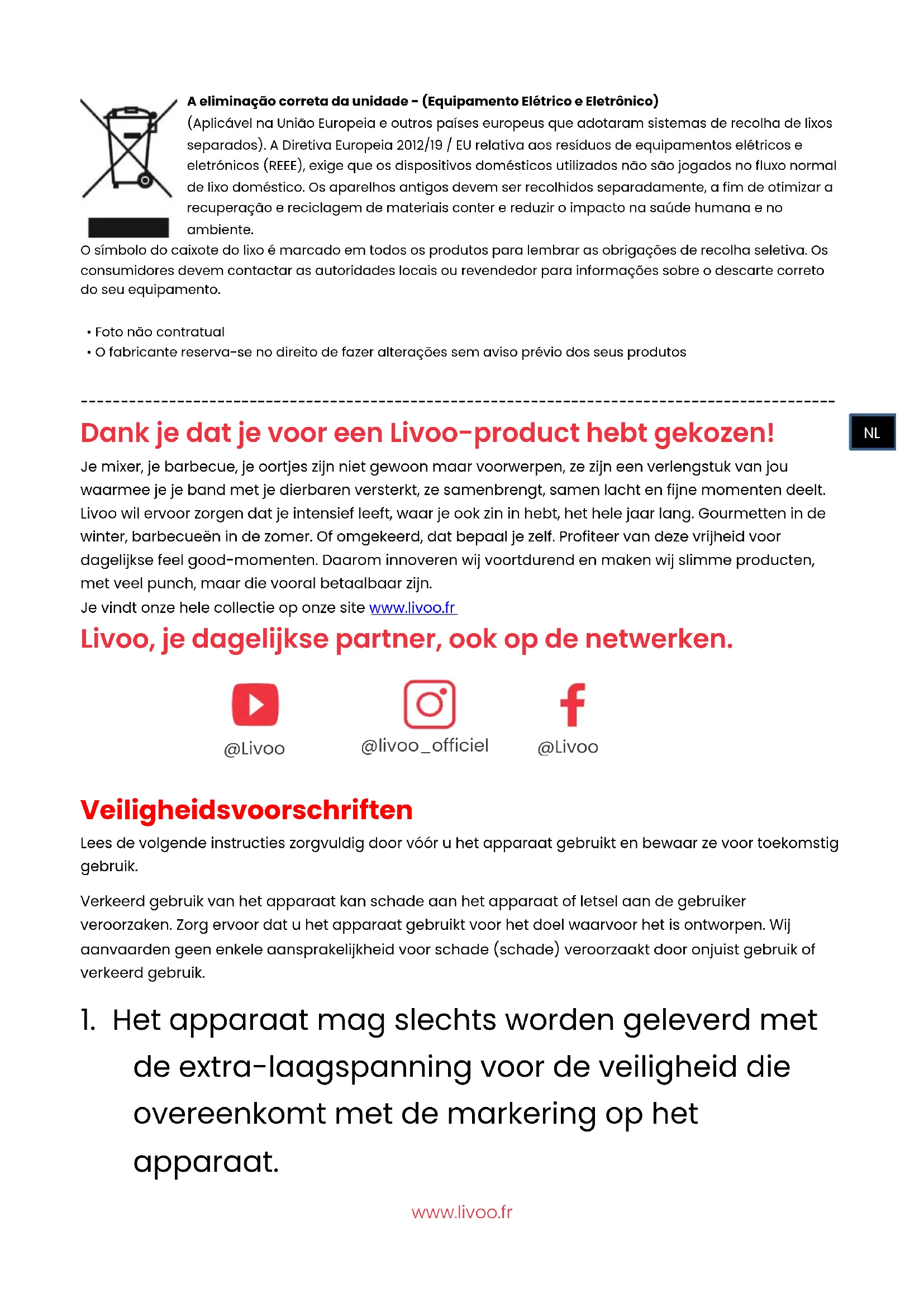 Dank je dat je voor een Livoo-product hebt gekozen! Je mixer, je barbecue, je oortjes zijn niet gewoon maar voorwerpen, ze zijn een verlengstuk van jou waarmee je je band met je dierbaren versterkt, ze samenbrengt, samen lacht en fijne momenten deelt. Livoo wil ervoor zorgen dat je intensief leeft, waar je ook zin in hebt, het hele jaar lang. Gourmetten in de winter, barbecueën in de zomer. Of omgekeerd, dat bepaal je zelf. Profiteer van deze vrijheid voor dagelijkse feel good-momenten. Daarom innoveren wij voortdurend en maken wij slimme producten, met veel punch, maar die vooral betaalbaar zijn. Je vindt onze hele collectie op onze site www.livoo.fr Livoo, je dagelijkse partner, ook op de netwerken.