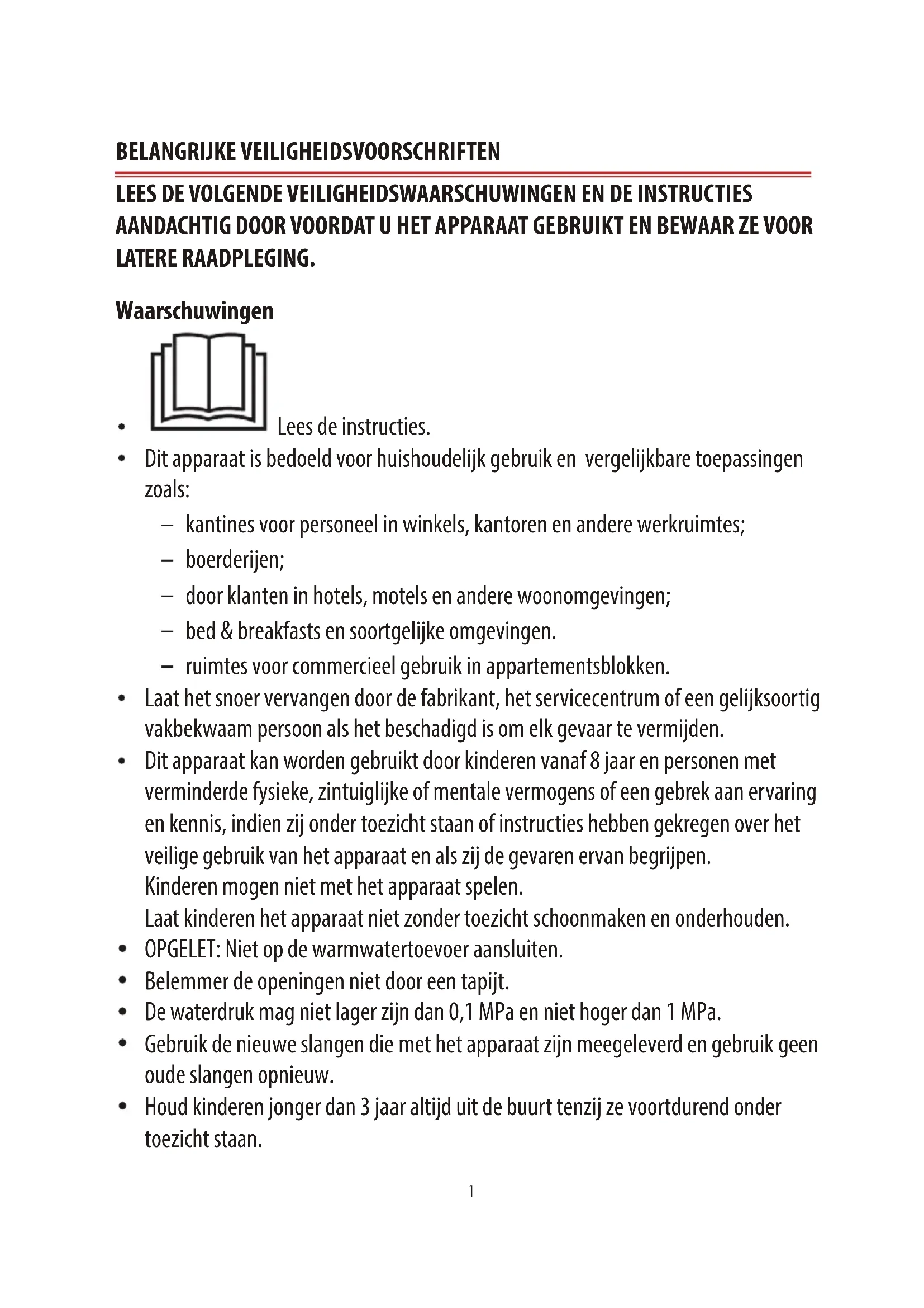 Lundi à Samedi MISE AU REBUTInhoud sopgave NL1 BELANGRIJKE VEILIGHEIDSVOORSCHRIFTEN LEES DE VOLGENDE VEILIGHEIDSWAARSCHUWINGEN EN DE INSTRUCTIES AANDACHTIG DOOR VOORDAT U HET APPARAAT GEBRUIKT EN BEWAAR ZE VOOR LATERE RAADPLEGING. Waarschuwingen Lees de instructies. Dit apparaat is bedoeld voor huishoudelijk gebruik en vergelijkbare toepassingen zoals: kantines voor personeel in winkels, kantoren en andere werkruimtes; boerderijen; door klanten in hotels, motels en andere woonomgevingen; bed & breakfasts en soortgelijke omgevingen. ruimtes voor commercieel gebruik in appartementsblokken. Laat het snoer vervangen door de fabrikant, het servicecentrum of een gelijksoortig vakbekwaam persoon als het beschadigd is om elk gevaar te vermijden. Dit apparaat kan worden gebruikt door kinderen vanaf 8 jaar en personen met verminderde fysieke, zintuiglijke of mentale vermogens of een gebrek aan ervaring en kennis, indien zij onder toezicht staan of instructies hebben gekregen over het veilige gebruik van het apparaat en als zij de gevaren ervan begrijpen. Kinderen mogen niet met het apparaat spelen. Laat kinderen het apparaat niet zonder toezicht schoonmaken en onderhouden. OPGELET: Niet op de warmwatertoevoer aansluiten. Belemmer de openingen niet door een tapijt. De waterdruk mag niet lager zijn dan 0,1 MPa en niet hoger dan 1 MPa. Gebruik de nieuwe slangen die met het apparaat zijn meegeleverd en gebruik geen oude slangen opnieuw. Houd kinderen jonger dan 3 jaar altijd uit de buurt tenzij ze voortdurend onder toezicht staan.Het maximum gewicht aan droog tetxtiel dat in het apparaat mag worden gestopt is 9 kg (voor de cyclus wassen) en 6 kg (voor de cyclus wassen en drogen).3 Veiligheidsmaatregelen Het apparaat is alleen bestemd voor gebruik binnenshuis. Houd het verpakkingsmateriaal van het apparaat uit de buurt van kinderen om elk gevaar te voorkomen. Steek de stekker nooit met natte handen in het stopcontact. Raak het apparaat nooit met natte handen of voeten aan. In geval van een defect, haal eerst de stekker uit het stopcontact en draai de kraan dicht. Repareer het apparaat nooit zelf. Neem contact op met een erkende reparateur. Overschrijd het maximum laadvermogen niet. De glazen deur wordt zeer heet tijdens de wascyclus. Houd kinderen en huisdieren uit de buurt van het apparaat wanneer in werking. Oefen nooit druk op de deur uit om deze tijdens de werking van het apparaat te openen. Laat kinderen nooit zonder toezicht in de buurt van het apparaat, ze kunnen zichzelf in het apparaat opsluiten. Na gebruik, haal de stekker uit het stopcontact en draai de waterkraan dicht. Dieren en kinderen kunnen in de machine klimmen. Controleer de machine voor elk gebruik. De stekker moet na het installeren van het apparaat eenvoudig bereikbaar zijn. Was gee benzine, ontvettingsmiddelen, chemische oplosmiddelen, kerosine, etc.) zijn gereinigd, gewassen, geweekt of gedept. Dit kan brand of explosie tot gevolg hebben. Installeer het apparaat niet in een badkamer, een zeer vochtige kamer of in een ruimte met explosieve of bijtende gassen.4 PRODUCTOVERZICHT5 Toebehoren1