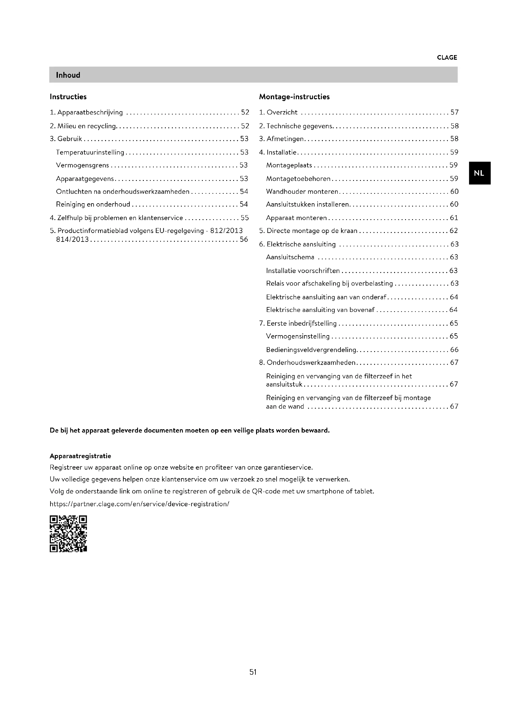 Inhoud Apparaatregistratie Registreer uw apparaat online op onze website en profiteer van onze garantieservice. Uw volledige gegevens helpen onze klantenservice om uw verzoek zo snel mogelijk te verwerken. Volg de onderstaande link om online te registreren of gebruik de QR-code met uw smartphone of tablet. https://partner.clage.com/en/service/device-registration/ Instructies . Apparaatbeschrijving ................................. . Milieu en recycling .................................... . Gebruik ............................................. Temperatuurinstelling ................................. Vermogensgrens ..................................... Apparaatgegevens .................................... Ontluchten na onderhoudswerkzaamheden .............. Reiniging en onderhoud ............................... . Zelfhulp bij problemen en klantenservice ................ . Productinformatieblad volgens EU-regelgeving - / / ........................................... Montage-instructies . Overzicht ........................................... . Technische gegevens .................................. . Afmetingen .......................................... . Installatie ............................................ Montageplaats ....................................... Montagetoebehoren .................................. Wandhouder monteren ................................ Aansluitstukken installeren ............................. Apparaat monteren ................................... . Directe montage op de kraan .......................... . Elektrische aansluiting ................................ Aansluitschema ...................................... Installatie voorschriften ............................... Relais voor afschakeling bij overbelasting ................ Elektrische aansluiting aan van onderaf .................. Elektrische aansluiting van bovenaf ..................... . Eerste inbedrijfstelling ................................ Vermogensinstelling .................................. Bedieningsveldvergrendeling ........................... . Onderhoudswerkzaamheden ........................... Reiniging en vervanging van de filterzeef in het aansluitstuk .......................................... Reiniging en vervanging van de filterzeef bij montage aan de wand ......................................... De bij het apparaat geleverde documenten moeten op een veilige plaats worden bewaard.NL DCX Next / DCX 13 Next
