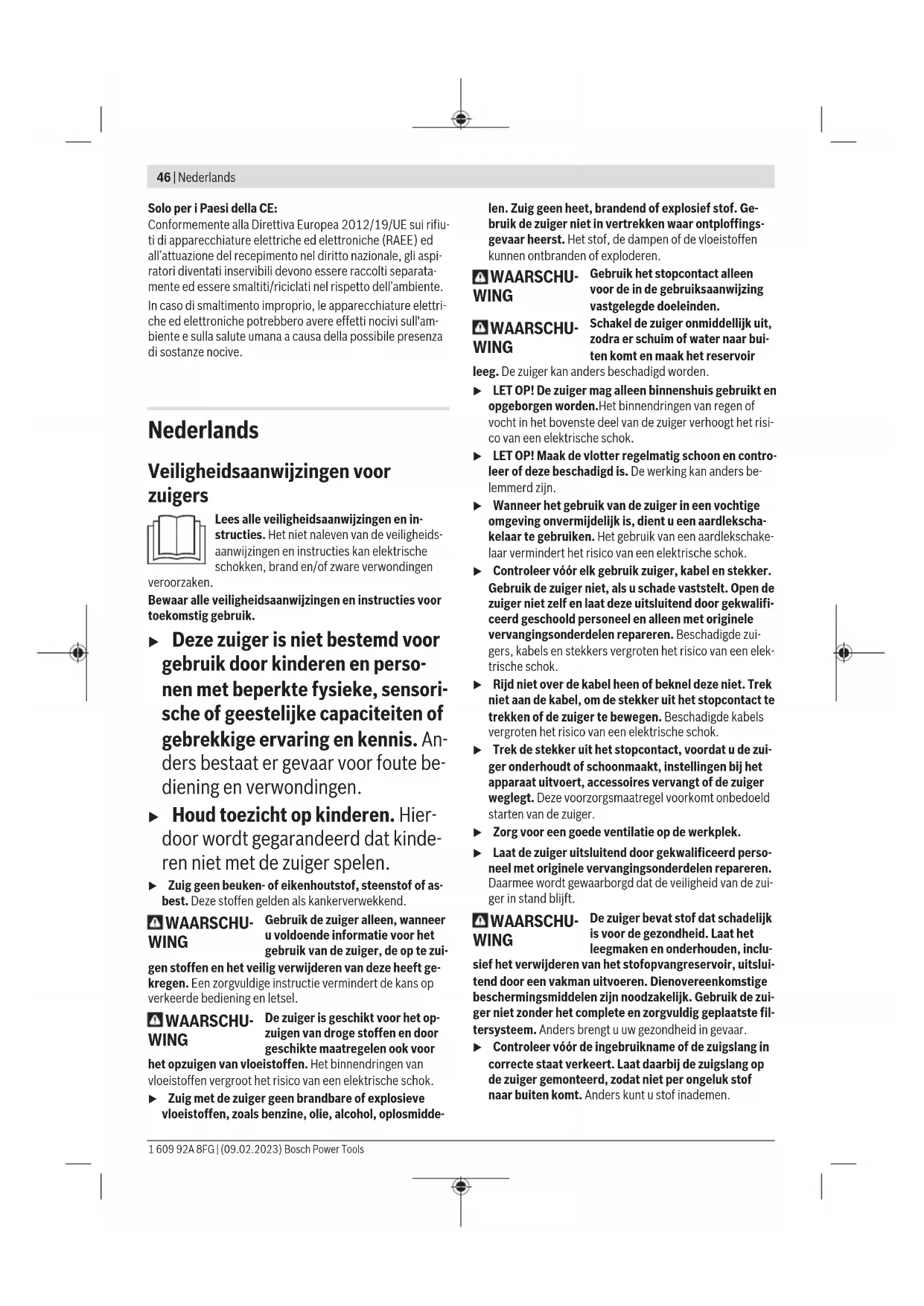 – Schuif de houder (14) voor de zuigslang (17) stevig in de daarvoor bestemde opname (25) tot deze vastklikt. Zuigslang monteren (zie afbeelding C) – Steek de zuigslang (17) stevig in de slangopname (2). Aanwijzing: Bij het zuigen ontstaat door de wrijving van het stof in de zuigslang en -accessoires een elektrostatische op- lading die de gebruiker in de vorm van statische ontlading kan voelen (afhankelijk van invloeden van buitenaf en licha- melijke gesteldheid). Bosch raadt aan altijd een antistatische zuigslang (accessoi- re) te gebruiken bij het zuigen van fijnstof en droge matera- len. Afvalzak of stofzak plaatsen/verwijderen (droog zuigen) (zie afbeeldingen D1–D2) Voor het droog zuigen kunt u een afvalzak (20) of een stof- zak (accessoire) in het reservoir (1) plaatsen. Daardoor wordt het afvoeren van het stof gemakkelijker. 1 609 92A 8FG | (09.02.2023) Bosch Power ToolsNederlands | 49 Afvalzak plaatsen – Open de sluitingen (7) en pak het bovenstuk van de zui- ger (6) af. – Leg de afvalzak (20) met de vulopening naar voren in het reservoir (1). – Trek de vulopening over de aansluitflens tot in de verla- ging van de aansluitflens. – Zorg ervoor dat de afvalzak (20) helemaal tegen de bin- nenwanden van het reservoir (1) ligt. – Sla de rest van de afvalzak (20) over de rand van het re- servoir (1). – Breng het bovenstuk van de zuiger (6) aan en sluit de slui- tingen (7). Afvalzak verwijderen en afsluiten – Open de sluitingen (7) en pak het bovenstuk van de zui- ger (6) af. – Trek de volle afvalzak(20) naar achter toe van de aan- sluitflens af. – Pak de afvalzak(20) voorzichtig, zonder deze te bescha- digen, uit het reservoir(1). Let er daarbij op dat de afvalzak niet langs de aansluit- flens of andere scherpe voorwerpen schuurt. – Bind de afvalzak (20) onder de vulopening dicht. Stofzak vervangen/plaatsen (accessoire) – Open de sluitingen (7) en pak het bovenstuk van de zui- ger (6) af. – Trek de volle stofzak naar achter van de aansluitflens af. Sluit de opening van de stofzak door het deksel om te klappen. Verwijder de afgesloten stofzak uit het reservoir (1). – Schuif de nieuwe stofzak over de aansluitflens van de zui- ger. Zorg ervoor dat de stofzak over de volle lengte tegen de binnenwand van het reservoir (1) ligt. – Breng het bovenstuk van de zuiger (6) aan en sluit de slui- tingen (7). Gebruik u Trek de stekker uit het stopcontact, voordat u de zui- ger onderhoudt of schoonmaakt, instellingen bij het apparaat uitvoert, accessoires vervangt of de zuiger weglegt. Deze voorzorgsmaatregel voorkomt onbedoeld starten van de zuiger. Let er bij het gebruik van de zuiger op dat de zwenkwielen (9) met de zwenkwielremmen (10) geblokkeerd zijn om de zuiger te beveiligen tegen abusievelijk wegrollen. Test vóór gebruik of de loopwielen (8) en zwenkwielen (9) op de be- treffende ondergrond hun werk doen. Ingebruikname u Let op de netspanning! De spanning van de stroombron moet overeenkomen met de gegevens op het typeplaatje van de zuiger. Met 230V aangeduide zuigers kunnen ook met 220V worden gebruikt. u Stel u op de hoogte van de in uw land geldende regels en wetten ten aanzien van de omgang met stof dat ge- vaarlijk voor de gezondheid is. De zuiger mag worden toegepast voor het zuigen van de vol- gende materialen: – stof met een expositiegrenswaarde >1mg/m