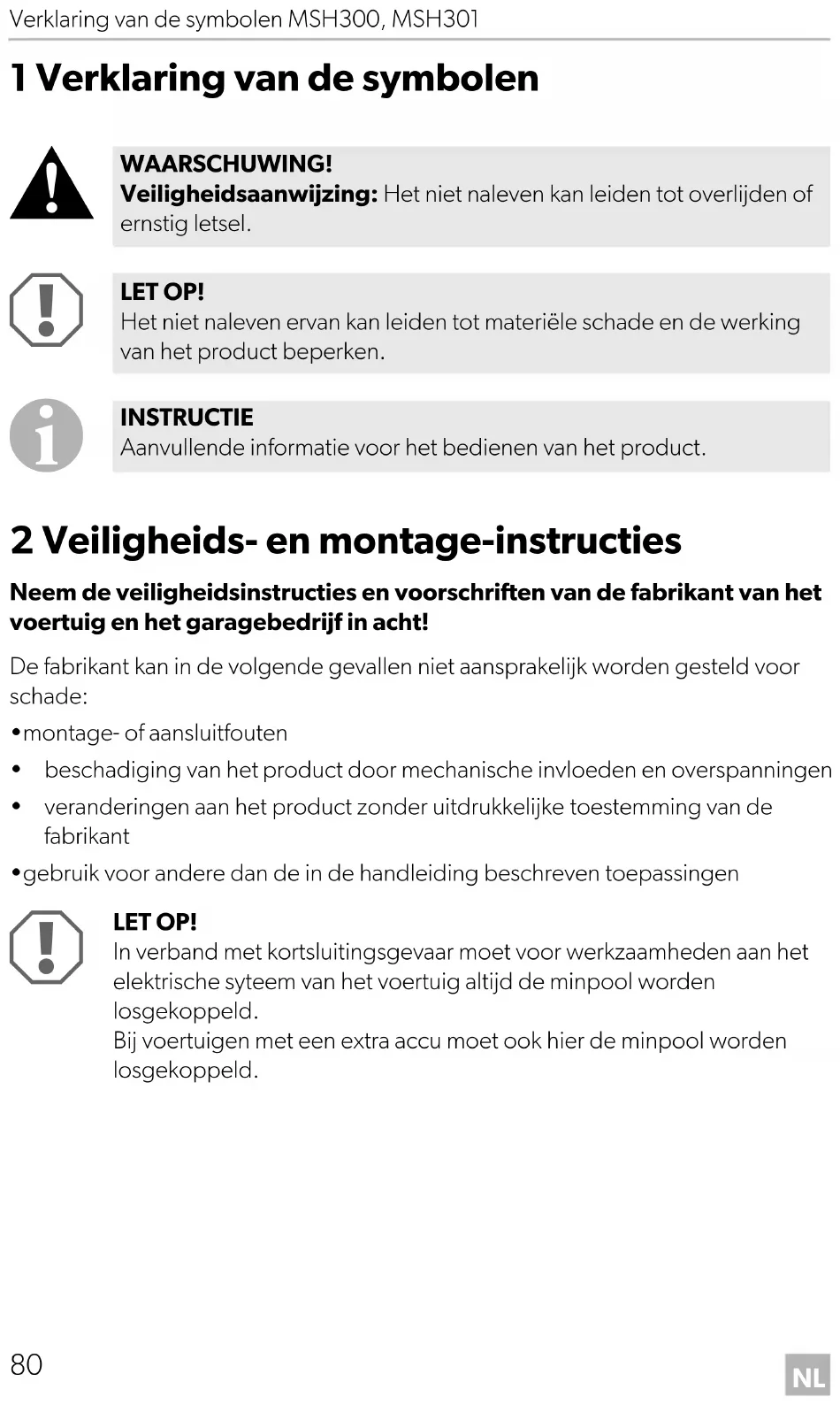 LET OP! In verband met kortsluitingsgevaar moet voor werkzaamheden aan het elektrische syteem van het voertuig altijd de minpool worden losgekoppeld. Bij voertuigen met een extra accu moet ook hier de minpool worden losgekoppeld. WAARSCHUWING! Veiligheidsaanwijzing: Het niet naleven kan leiden tot overlijden of ernstig letsel. LET OP! Het niet naleven ervan kan leiden tot materiële schade en de werking van het product beperken. INSTRUCTIE Aanvullende informatie voor het bedienen van het product. MSH300--IO-16s.book Seite 80 Donnerstag, 13. Juli 2017 10:28 10NL MSH300, MSH301 Veiligheids- en montage-instructies