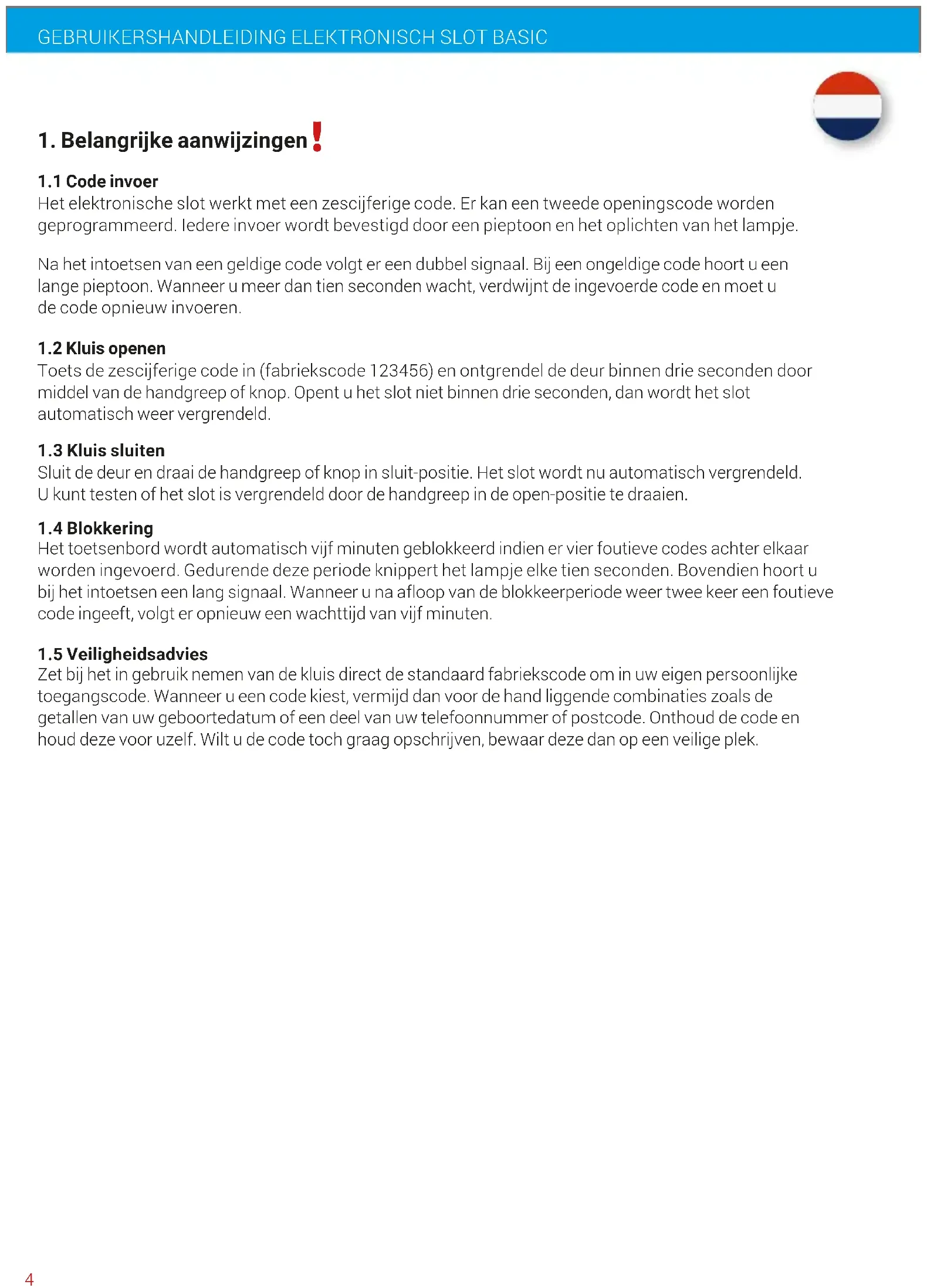 Toets de zescijferige code in (fabriekscode 123456) en ontgrendel de deur binnen drie seconden door middel van de handgreep of knop. Opent u het slot niet binnen drie seconden, dan wordt het slot automatisch weer vergrendeld.