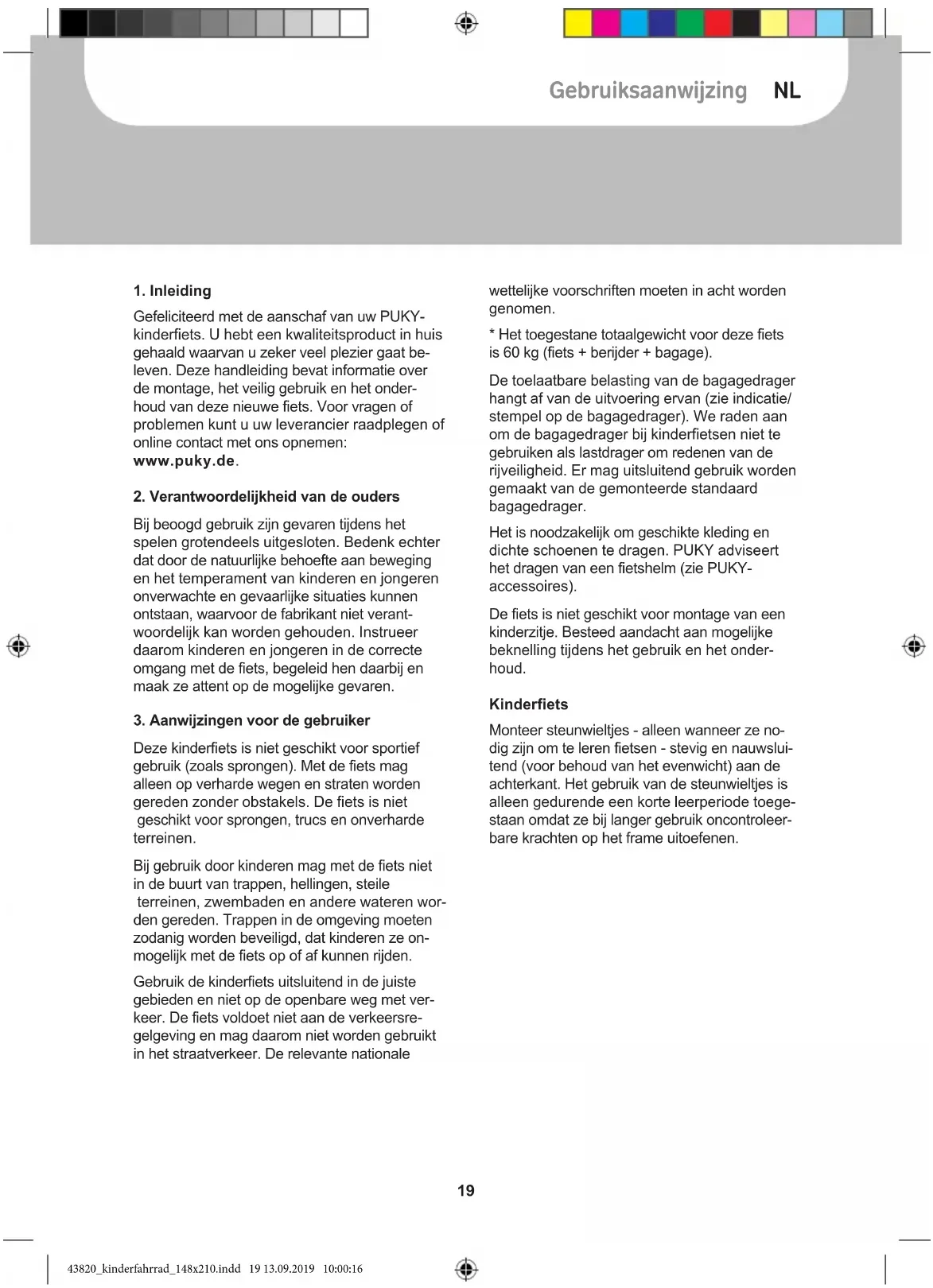 Gefeliciteerd met de aanschaf van uw PUKY- kinderfiets. U hebt een kwaliteitsproduct in huis gehaald waarvan u zeker veel plezier gaat be- leven. Deze handleiding bevat informatie over de montage, het veilig gebruik en het onder- houd van deze nieuwe fiets. Voor vragen of problemen kunt u uw leverancier raadplegen of online contact met ons opnemen: www.puky.de.