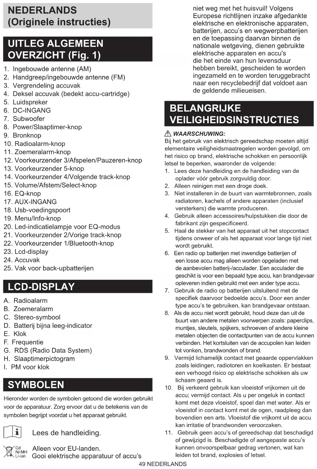 SYMBOLEN Hieronder worden de symbolen getoond die worden gebruikt voor de apparatuur. Zorg ervoor dat u de betekenis van de symbolen begrijpt voordat u het apparaat gebruikt. Lees de handleiding. Alleen voor EU-landen. Gooi elektrische apparatuur of accu’s niet weg met het huisvuil! Volgens Europese richtlijnen inzake afgedankte elektrische en elektronische apparaten, batterijen, accu’s en wegwerpbatterijen en de toepassing daarvan binnen de nationale wetgeving, dienen gebruikte elektrische apparaten en accu's die het einde van hun levensduur hebben bereikt, gescheiden te worden ingezameld en te worden teruggebracht naar een recyclebedrijf dat voldoet aan de geldende milieueisen. BELANGRIJKE VEILIGHEIDSINSTRUCTIES WAARSCHUWING: Bij het gebruik van elektrisch gereedschap moeten altijd elementaire veiligheidsmaatregelen worden gevolgd, om het risico op brand, elektrische schokken en persoonlijk letsel te beperken, waaronder de volgende: