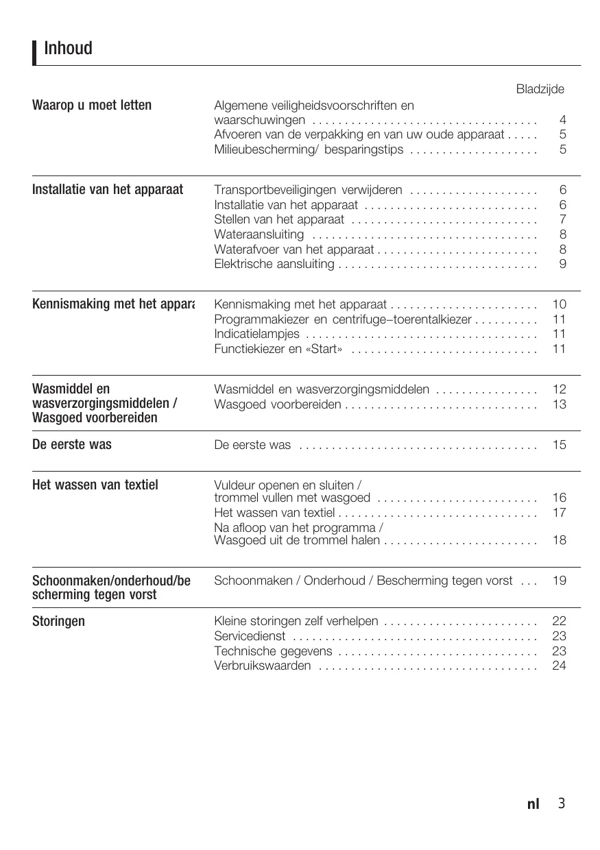 Lees voordat u het apparaat voor het eerst in gebruik neemt deze aanwijzingen nauwkeurig door. U vindt daarin belangrijke informatie over installatie, gebruik en veiligheid van het apparaat. Bewaar de gebruiksaanwijzing voor een eventuele latere bezitter van het apparaat. Het apparaat uitsluitend volgens het installatievoorschrift installeren. Transportbeveiliging verwijderen en bewaren. Een (bijv. tijdens het transport) zichtbaar beschadigd apparaat niet op het elektriciteitsnet aansluiten. Neem in geval van twijfel contact op met de Servicedienst of met uw leverancier. Een beschadigde kabel mag alleen door de Servicedienst vervangen worden. Neem bij het wassen van textiel de volgende punten in acht: