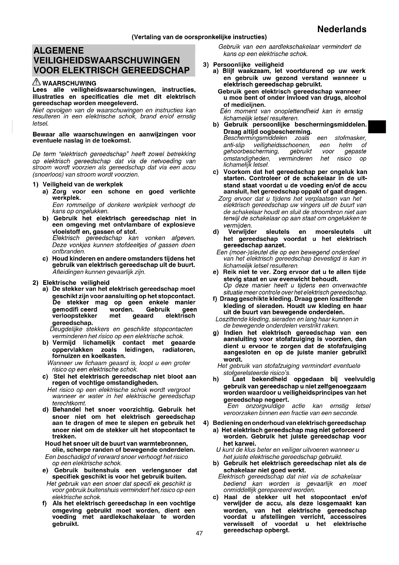 WAARSCHUWING Lees alle veiligheidswaarschuwingen, instructies, illustraties en specifi caties die met dit elektrisch gereedschap worden meegeleverd. Niet opvolgen van de waarschuwingen en instructies kan resulteren in een elektrische schok, brand en/of ernstig letsel. Bewaar alle waarschuwingen en aanwijzingen voor eventuele naslag in de toekomst. De term “elektrisch gereedschap” heeft zowel betrekking op elektrisch gereedschap dat via de netvoeding van stroom wordt voorzien als gereedschap dat via een accu (snoerloos) van stroom wordt voorzien.