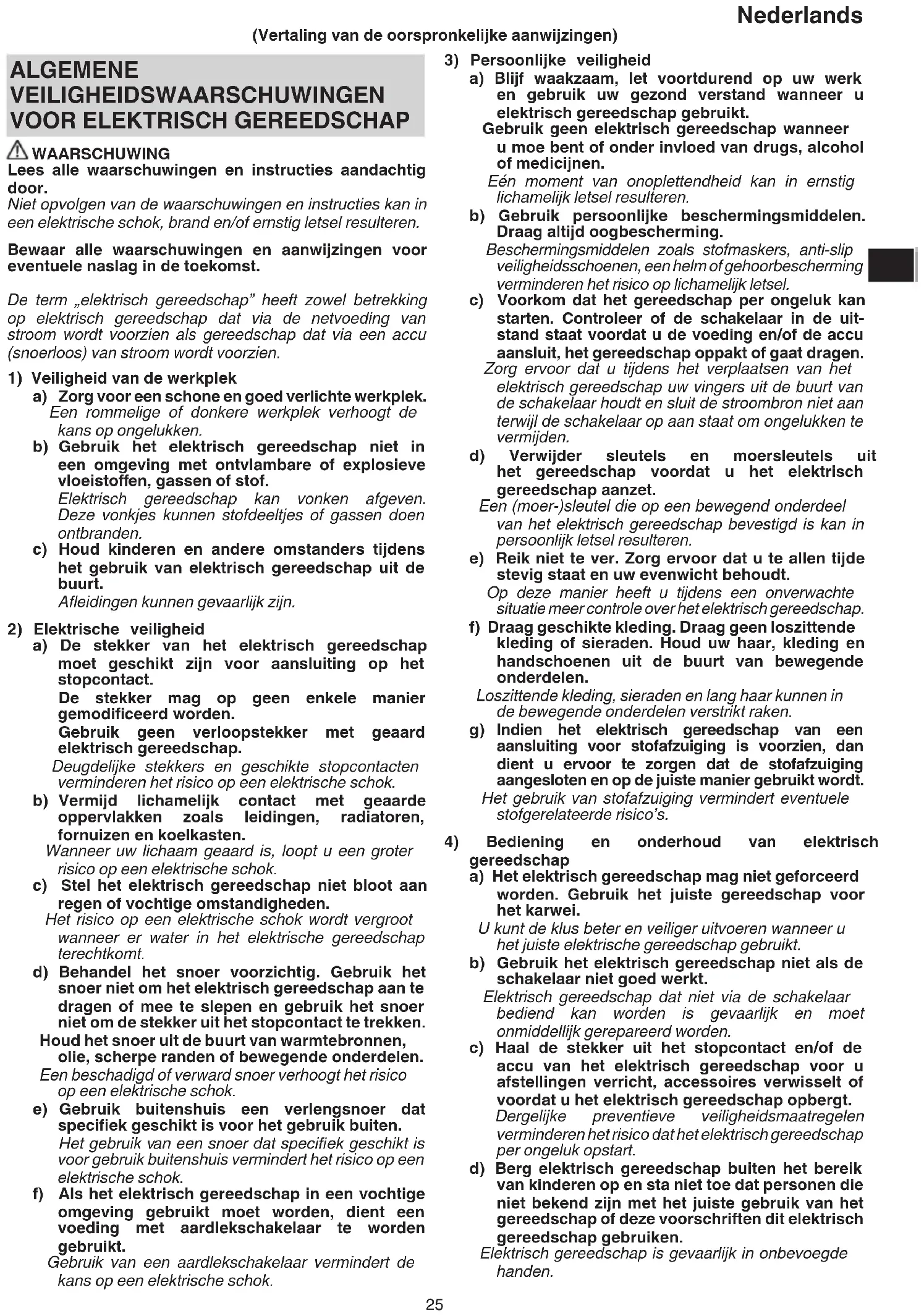 WAARSCHUWING Lees alle waarschuwingen en instructies aandachtig door. Niet opvolgen van de waarschuwingen en instructies kan in een elektrische schok, brand en/of ernstig letsel resulteren. Bewaar alle waarschuwingen en aanwijzingen voor eventuele naslag in de toekomst. De term „elektrisch gereedschap” heeft zowel betrekking op elektrisch gereedschap dat via de netvoeding van stroom wordt voorzien als gereedschap dat via een accu (snoerloos) van stroom wordt voorzien.