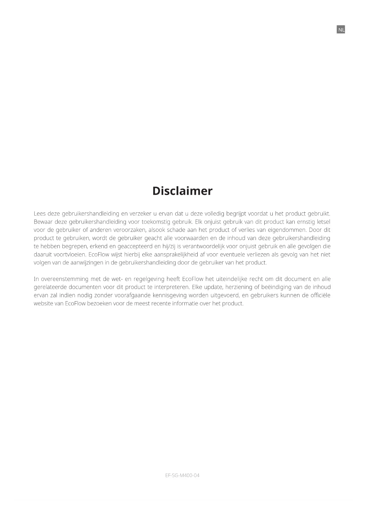 ¿Cuáles son las precauciones a tomar en el uso de paneles solares? El panel solar está hecho de una placa de silicio monocristalina. Durante la instalación y el uso, no lo deje caer al suelo con fuerza ni utilice herramientas para golpear la supercie. No pise ni se siente en el panel solar para evitar que la placa de silicio monocristalina se rompa y afecte a su uso. Los daños articiales anularán la garantía. ¿Puedo utilizar paneles solares de diferentes especicaciones para uso mixto? Sí, pero no se recomienda. Los diferentes controladores de almacenamiento de energía tienen requisitos y restricciones sobre la salida de paneles solares. Cuando se utilizan paneles solares con diferentes valores de corriente en serie, estos estarán limitados, lo que dará como resultado la incapacidad de liberar la potencia de salida e incluso el efecto de placa corta de 1+1<2. ¿Puedo conectar paneles solares en paralelo? Sí. La conexión en paralelo puede duplicar la corriente y aumentar la potencia. Puede consultar los requisitos de los controladores solares y los dispositivos de almacenamiento de energía para asegurarse de que admiten valores mayores de corriente de entrada para determinar mejor el número de paneles solares conectados en paralelo. Además, es necesario prestar atención a la hora de seleccionar un cable con un diámetro adecuado para una conexión segura de acuerdo con el cambio de la corriente de salida. ¿Es necesario limpiar los paneles solares con frecuencia? Sí. Cuando se utilizan al aire libre durante mucho tiempo, los paneles solares son propensos a acumular polvo y objetos extraños en la supercie, lo que provoca un cierto grado de oclusión de la luz y reduce la producción de generación de energía. La limpieza frecuente mantiene la supercie del panel solar limpia y libre de obstrucciones, lo que permite una mejor salida de energía del panel.400 W Rigid Solar Panel Gebruikershandleiding V1.0NL Disclaimer EF-SG-M400-04 Lees deze gebruikershandleiding en verzeker u ervan dat u deze volledig begrijpt voordat u het product gebruikt. Bewaar deze gebruikershandleiding voor toekomstig gebruik. Elk onjuist gebruik van dit product kan ernstig letsel voor de gebruiker of anderen veroorzaken, alsook schade aan het product of verlies van eigendommen. Door dit product te gebruiken, wordt de gebruiker geacht alle voorwaarden en de inhoud van deze gebruikershandleiding te hebben begrepen, erkend en geaccepteerd en hij/zij is verantwoordelijk voor onjuist gebruik en alle gevolgen die daaruit voortvloeien. EcoFlow wijst hierbij elke aansprakelijkheid af voor eventuele verliezen als gevolg van het niet volgen van de aanwijzingen in de gebruikershandleiding door de gebruiker van het product. In overeenstemming met de wet- en regelgeving heeft EcoFlow het uiteindelijke recht om dit document en alle gerelateerde documenten voor dit product te interpreteren. Elke update, herziening of beëindiging van de inhoud ervan zal indien nodig zonder voorafgaande kennisgeving worden uitgevoerd, en gebruikers kunnen de officiële website van EcoFlow bezoeken voor de meest recente informatie over het product.NL Inhoud Technische specicaties Veiligheidsinstructies Installatie Gebruik Vereisten voorafgaand aan installatie Meerdere zonnepanelen aansluiten Montageopeningen gebruiken Installatielocatie kiezen Installatieprocedure Voorzorgsmaatregelen Driehoeksbeugel installeren Steunbeugel installeren Bouten installeren Drukblokken installeren Verzorging en onderhoud Veelvoorkomende storingen en hantering Inhoud van de doos Veelgestelde vragen