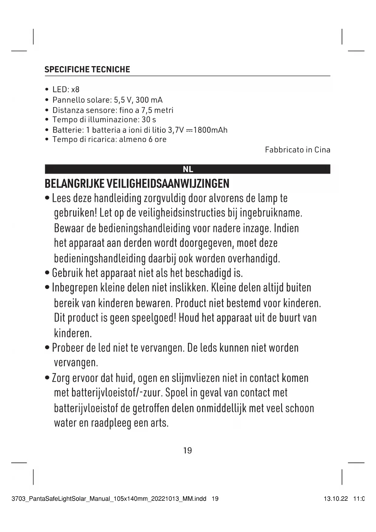 - Zorg ervoor dat huid, ogen en slijmvliezen niet in contact komen met batterijvloeistof/-zuur. Spoel in geval van contact met batterijvloeistof de getroffen delen onmiddellijk met veel schoon water en raadpleeg een arts. M33703_PantaSafeLightSolar_Manual_105x140mm_20221013_MM.indd 19M33703_PantaSafeLightSolar_Manual_105x140mm_20221013_MM.indd 19 13.10.22 11:0713.10.22 11:0720