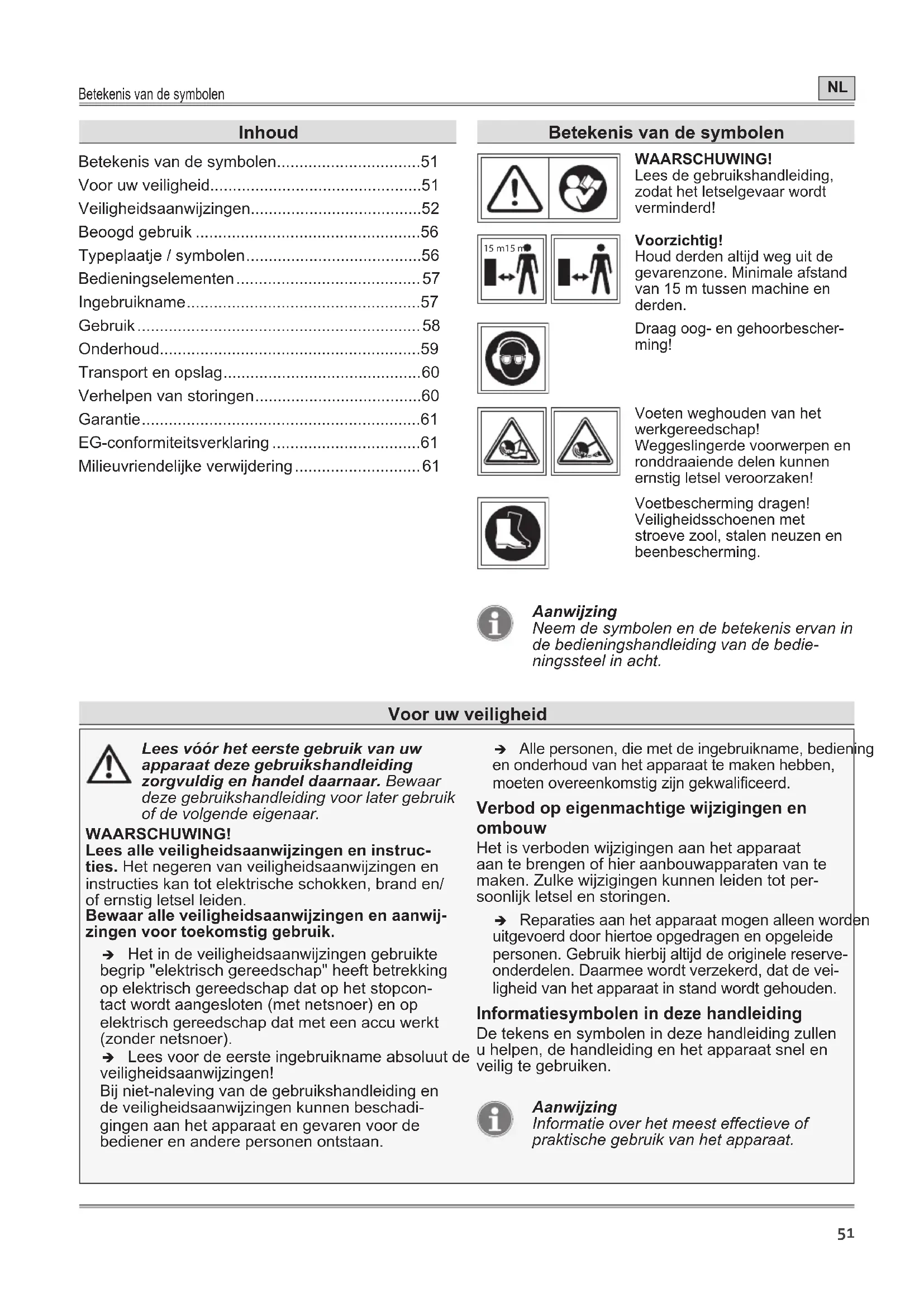- Milieuvriendelijke verwijdering Betekenis van de symbolen WAARSCHUWING! Lees de gebruikshandleiding, zodat het letselgevaar wordt verminderd! 15 m15 m Voorzichtig! Houd derden altijd weg uit de gevarenzone. Minimale afstand van 15 m tussen machine en derden. Draag oog- en gehoorbescher- ming! Voeten weghouden van het werkgereedschap! Weggeslingerde voorwerpen en ronddraaiende delen kunnen ernstig letsel veroorzaken! Voetbescherming dragen! Veiligheidsschoenen met stroeve zool, stalen neuzen en beenbescherming. Aanwijzing Neem de symbolen en de betekenis ervan in de bedieningshandleiding van de bedie- ningssteel in acht. Voor uw veiligheid Lees vóór het eerste gebruik van uw apparaat deze gebruikshandleiding zorgvuldig en handel daarnaar. Bewaar deze gebruikshandleiding voor later gebruik of de volgende eigenaar. WAARSCHUWING! Lees alle veiligheidsaanwijzingen en instruc- ties. Het negeren van veiligheidsaanwijzingen en instructies kan tot elektrische schokken, brand en/ of ernstig letsel leiden. Bewaar alle veiligheidsaanwijzingen en aanwij- zingen voor toekomstig gebruik. Î Het in de veiligheidsaanwijzingen gebruikte begrip "elektrisch gereedschap" heeft betrekking op elektrisch gereedschap dat op het stopcon- tact wordt aangesloten (met netsnoer) en op elektrisch gereedschap dat met een accu werkt (zonder netsnoer). Î Lees voor de eerste ingebruikname absoluut de veiligheidsaanwijzingen! Bij niet-naleving van de gebruikshandleiding en de veiligheidsaanwijzingen kunnen beschadi- gingen aan het apparaat en gevaren voor de bediener en andere personen ontstaan. Î Alle personen, die met de ingebruikname, bediening en onderhoud van het apparaat te maken hebben, moeten overeenkomstig zijn gekwaliceerd. Verbod op eigenmachtige wijzigingen en ombouw Het is verboden wijzigingen aan het apparaat aan te brengen of hier aanbouwapparaten van te maken. Zulke wijzigingen kunnen leiden tot per- soonlijk letsel en storingen. Î Reparaties aan het apparaat mogen alleen worden uitgevoerd door hiertoe opgedragen en opgeleide personen. Gebruik hierbij altijd de originele reserve- onderdelen. Daarmee wordt verzekerd, dat de vei- ligheid van het apparaat in stand wordt gehouden. Informatiesymbolen in deze handleiding De tekens en symbolen in deze handleiding zullen u helpen, de handleiding en het apparaat snel en veilig te gebruiken. Aanwijzing Informatie over het meest effectieve of praktische gebruik van het apparaat. InhoudVoor uw veiligheid p. 61