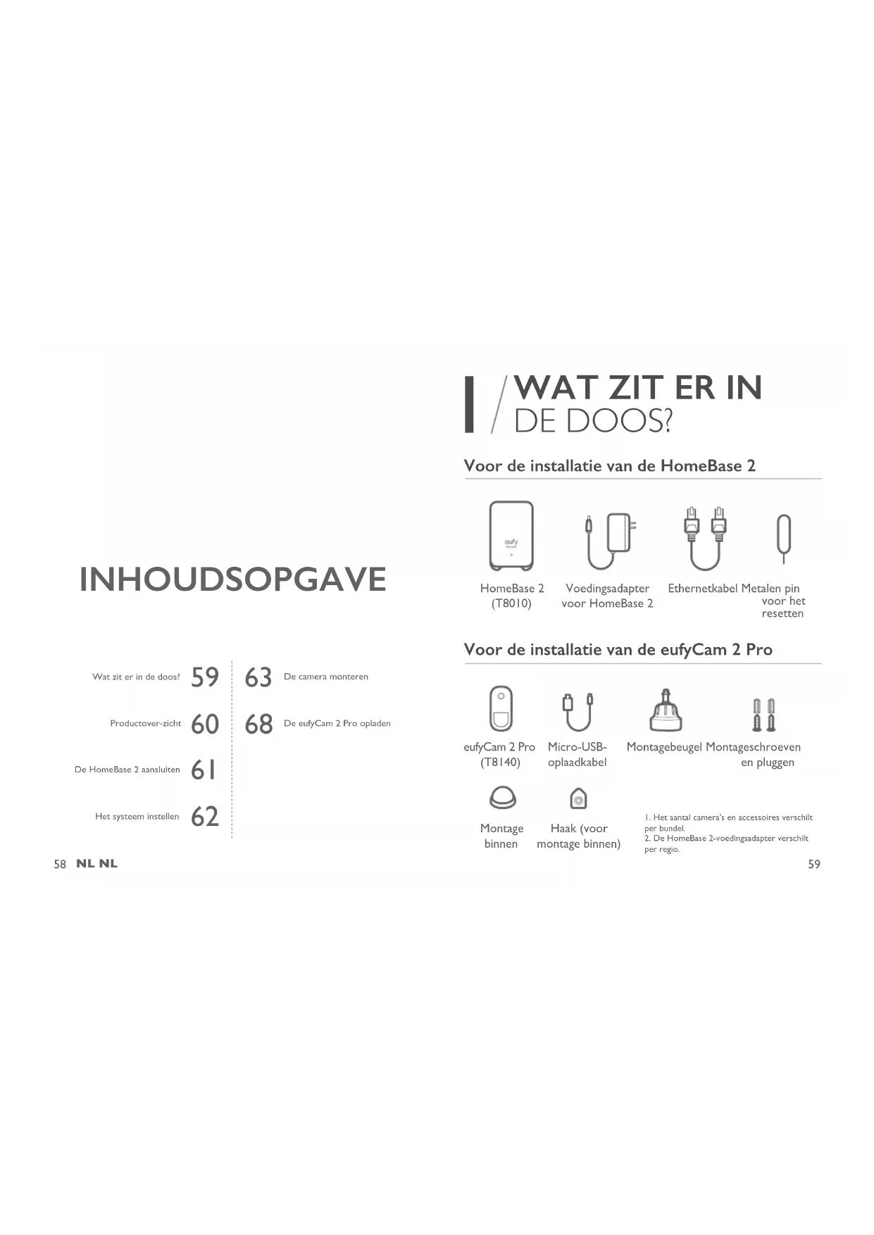 1. Het aantal camera's en accessoires verschilt per bundel. 2. De HomeBase 2-voedingsadapter verschilt per regio.60