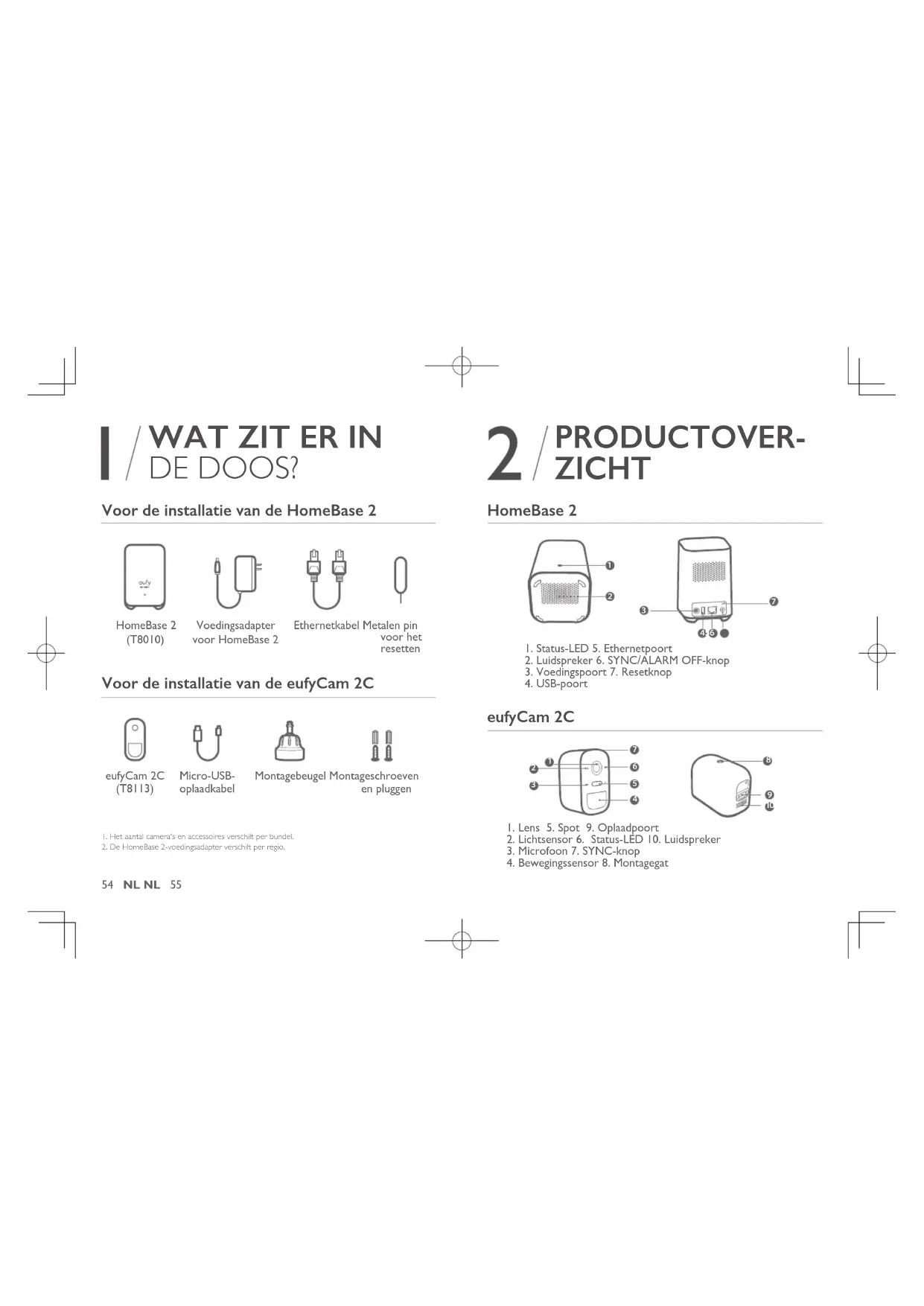 DE DOOS? Voor de installatie van de HomeBase 2 HomeBase 2 (T8010) Voedingsadapter voor HomeBase 2 Ethernetkabel Metalen pin voor het resetten Voor de installatie van de eufyCam 2C eufyCam 2C (T8113) Micro-USB- oplaadkabel Montagebeugel Montageschroeven en pluggen