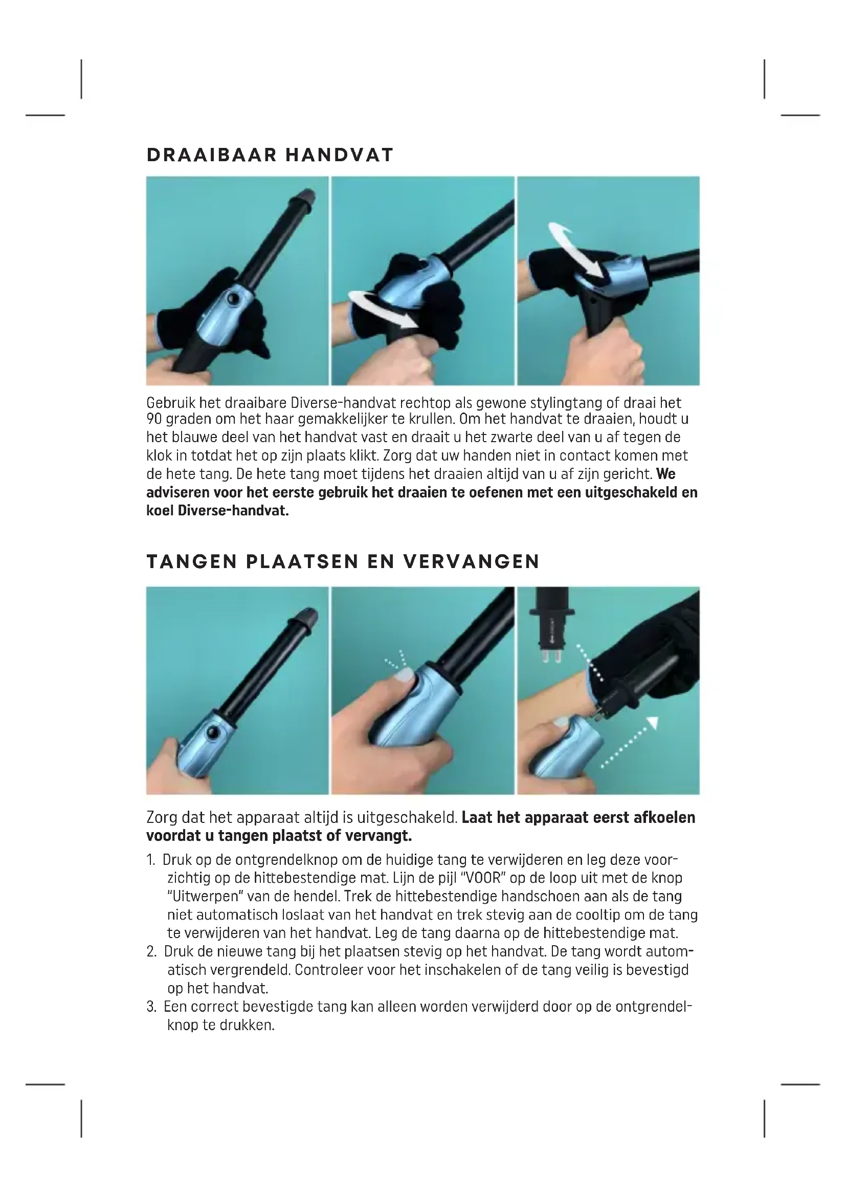 atisch vergrendeld. Controleer voor het inschakelen of de tang veilig is bevestigd op het handvat.