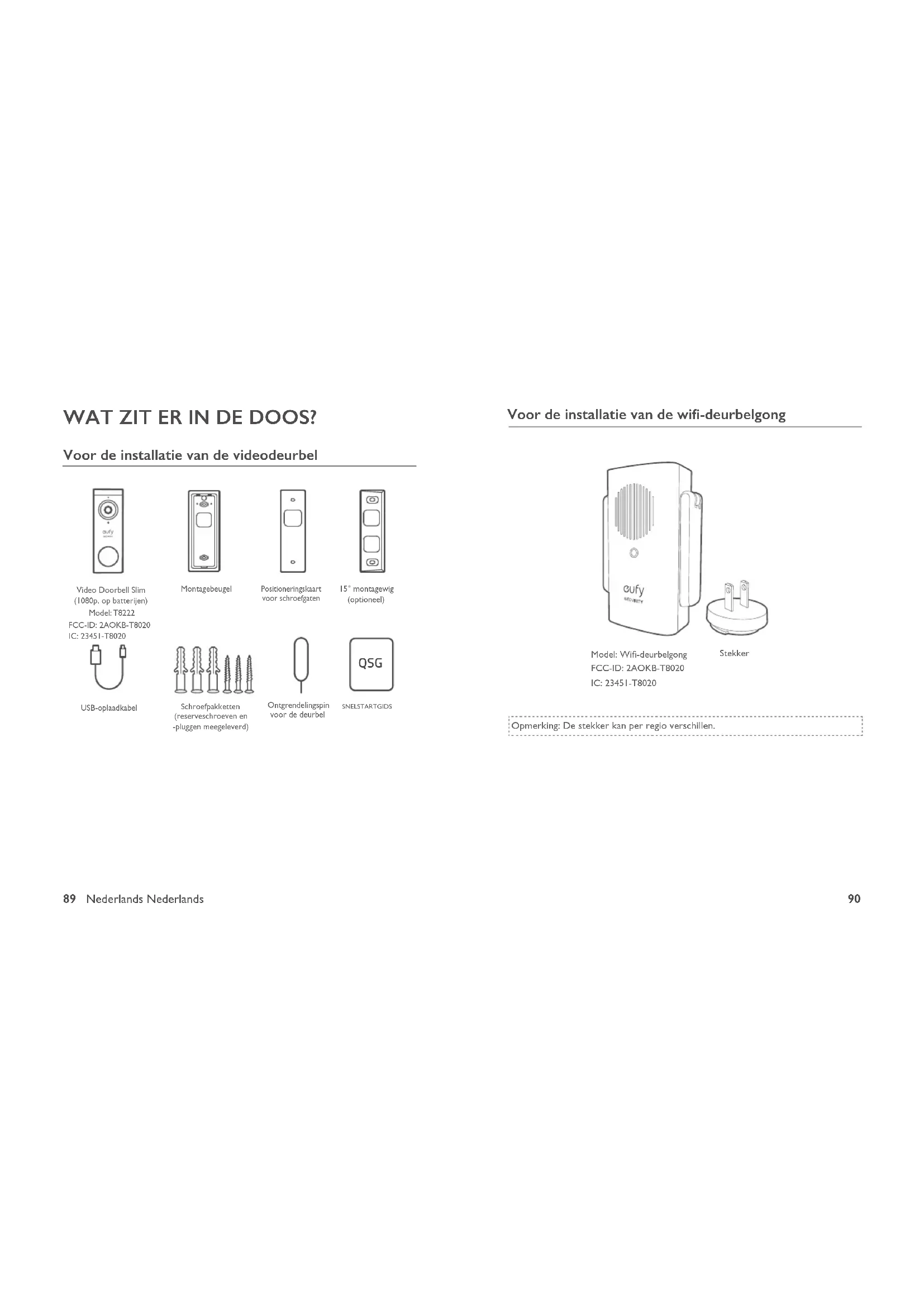 WAT ZIT ER IN DE DOOS? Voor de installatie van de videodeurbel QSG Video Doorbell Slim (1080p, op batterijen) Model: T8222Schroefpakketten (reserveschroeven en -pluggen meegeleverd)SNELSTARTGIDSPositioneringskaart voor schroefgatenOntgrendelingspin voor de deurbel15° montagewig (optioneel)MontagebeugelFCC-ID: 2AOKB-T8020IC: 23451-T8020USB-oplaadkabel Voor de installatie van de wi-deurbelgong Model: Wi-deurbelgongFCC-ID: 2AOKB-T8020IC: 23451-T8020 Opmerking: De stekker kan per regio verschillen. Stekker91 Nederlands Nederlands