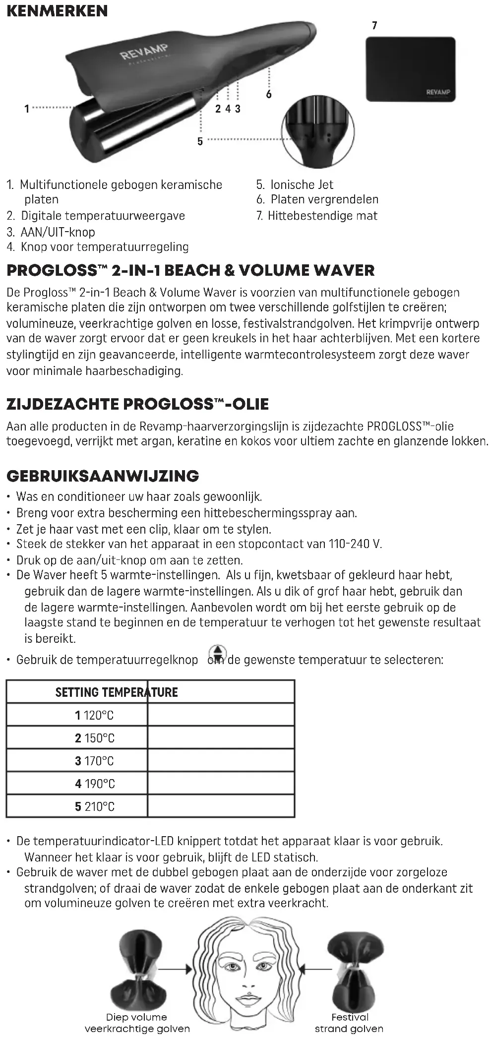- Schakel na gebruik de waver uit, trek de stekker uit het stopcontact, plaats op de hiebestendige mat (Feature 7) en laat voor het opbergen eerst afkoelen. Volg ons via www.revamphair.com voor de nieuwste tips en adviezen over haar. Let op: