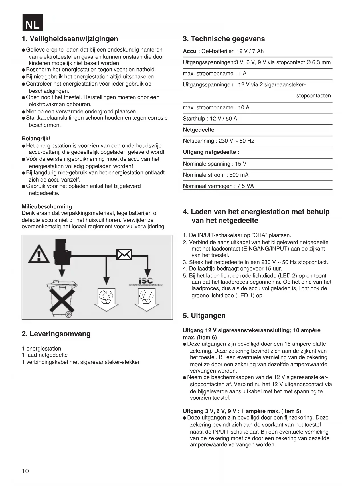 Gelieve erop te letten dat bij een ondeskundig hanteren van elektrotoestellen gevaren kunnen onstaan die door kinderen mogelijk niet beseft worden. Bescherm het energiestation tegen vocht en natheid. Bij niet-gebruik het energiestation altijd uitschakelen. Controleer het energiestation vóór ieder gebruik op beschadigingen. Open nooit het toestel. Herstellingen moeten door een elektrovakman gebeuren. Niet op een verwarmde ondergrond plaatsen. Startkabelaansluitingen schoon houden en tegen corrosiebeschermen.Belangrijk! Het energiestation is voorzien van een onderhoudsvrije accu-batterij, die gedeeltelijk opgeladen geleverd wordt. Vóór de eerste ingebruikneming moet de accu van het energiestation volledig opgeladen worden! Bij langdurig niet-gebruik van het energiestation ontlaadt zich de accu vanzelf. Gebruik voor het opladen enkel het bijgeleverd netgedeelte.MilieubeschermingDenk eraan dat verpakkingsmateriaal, lege batterijen ofdefecte accu’s niet bij het huisvuil horen. Verwijder zeovereenkomstig het locaal reglement voor vuilverwijdering.