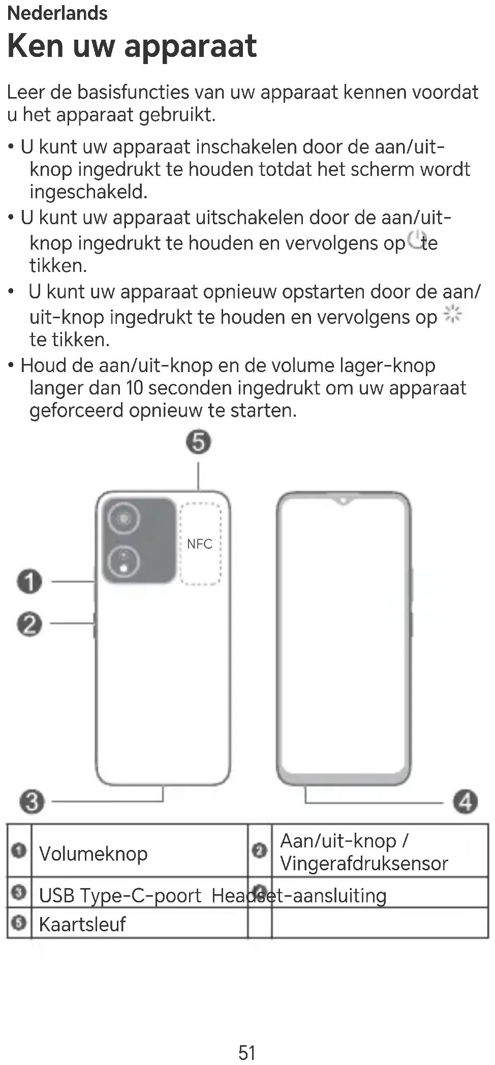 Volumeknop Aan/uit-knop / Vingerafdruksensor USB Type-C-poo Headset-aansluiting Kaasleuf 51• Houd het NFC-gedeelte dicht bij andere apparaten of objecten wanneer u de NFC-functie gebruikt.