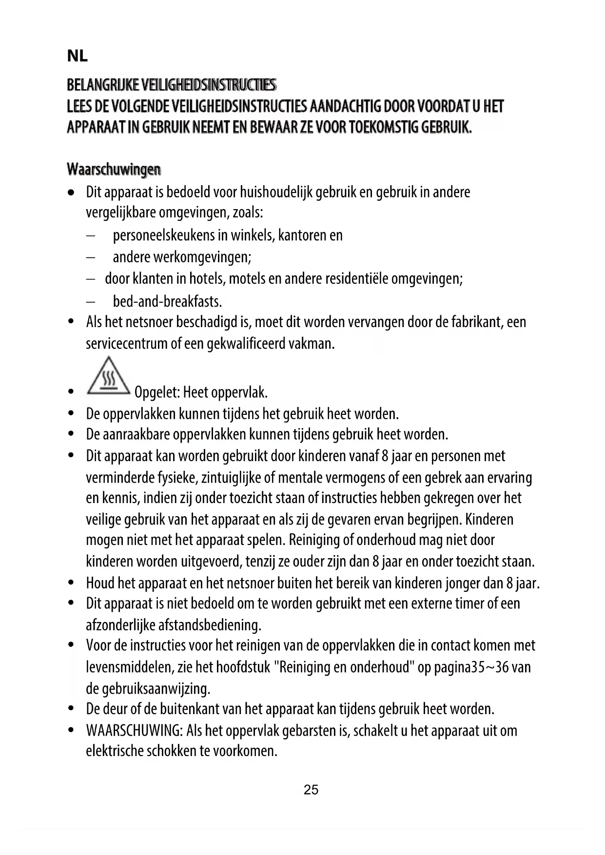 Opgelet: Heet oppervlak. y De oppervlakken kunnen tijdens het gebruik heet worden. y De aanraakbare oppervlakken kunnen tijdens gebruik heet worden. y Dit apparaat kan worden gebruikt door kinderen vanaf 8 jaar en personen met verminderde fysieke, zintuiglijke of mentale vermogens of een gebrek aan ervaring en kennis, indien zij onder toezicht staan of instructies hebben gekregen over het veilige gebruik van het apparaat en als zij de gevaren ervan begrijpen. Kindere