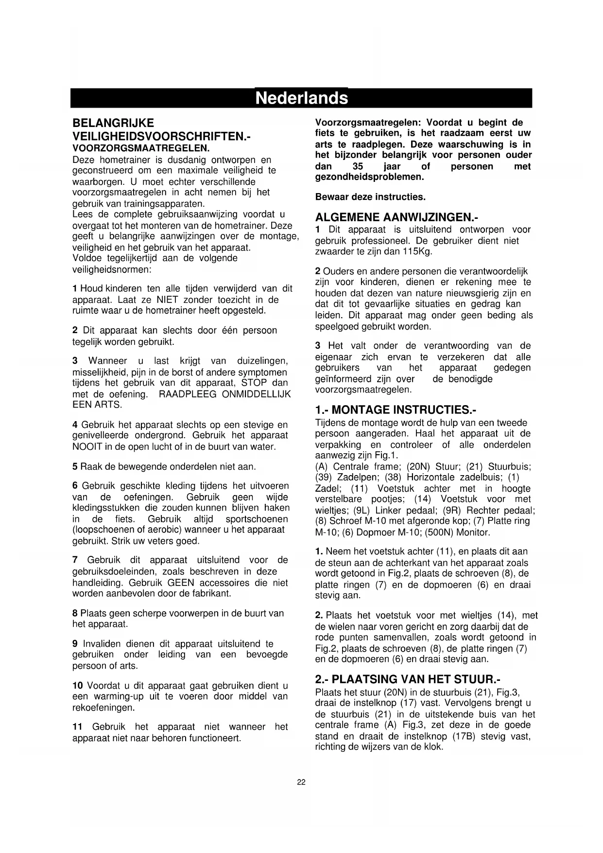 Nederlands BELANGRIJKE VEILIGHEIDSVOORSCHRIFTEN.- VOORZORGSMAATREGELEN. Deze hometrainer is dusdanig ontworpen en geconstrueerd om een maximale veiligheid te waarborgen. U moet echter verschillende voorzorgsmaatregelen in acht nemen bij het gebruik van trainingsapparaten. Lees de complete gebruiksaanwijzing voordat u overgaat tot het monteren van de hometrainer. Deze geeft u belangrijke aanwijzingen over de montage, veiligheid en het gebruik van het apparaat. Voldoe tegelijkertijd aan de volgende veiligheidsnormen: 1 Houd kinderen ten alle tijden verwijderd van dit apparaat. Laat ze NIET zonder toezicht in de ruimte waar u de hometrainer heeft opgesteld. 2 Dit apparaat kan slechts door één persoon tegelijk worden gebruikt. 3 Wanneer u last krijgt van duizelingen, misselijkheid, pijn in de borst of andere symptomen tijdens het gebruik van dit apparaat, STOP dan met de oefening. RAADPLEEG ONMIDDELLIJK EEN ARTS. 4 Gebruik het apparaat slechts op een stevige en genivelleerde ondergrond. Gebruik het apparaat NOOIT in de open lucht of in de buurt van water. 5 Raak de bewegende onderdelen niet aan.