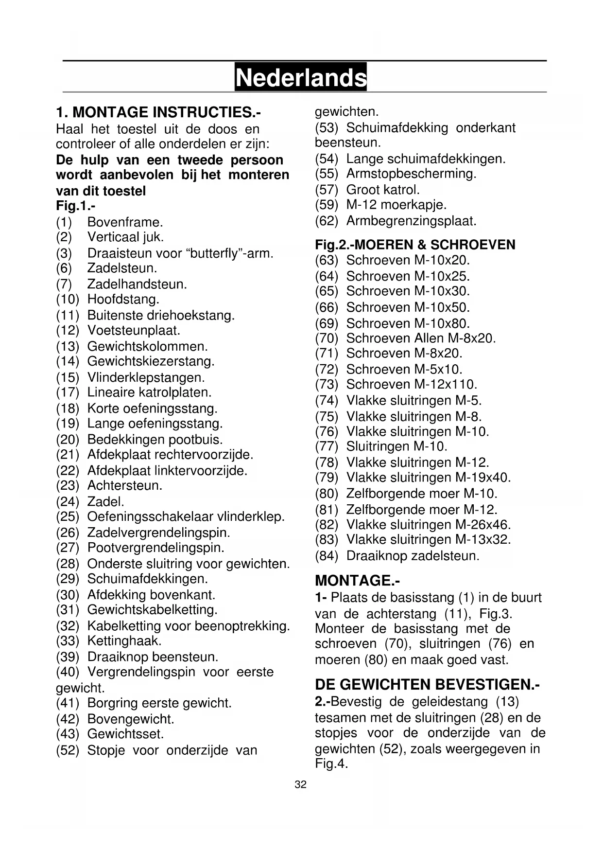 Haal het toestel uit de doos en controleer of alle onderdelen er zijn: De hulp van een tweede persoon wordt aanbevolen bij het monteren van dit toestel Fig.1.- (1) Bovenframe. (2) Verticaal juk. (3) Draaisteun voor “butterfly”-arm. (6) Zadelsteun. (7) Zadelhandsteun. (10) Hoofdstang. (11) Buitenste driehoekstang. (12) Voetsteunplaat. (13) Gewichtskolommen. (14) Gewichtskiezerstang. (15) Vlinderklepstangen. (17) Lineaire katrolplaten. (18) Korte oefeningsstang. (19) Lange oefeningsstang. (20) Bedekkingen pootbuis. (21) Afdekplaat rechtervoorzijde. (22) Afdekplaat linktervoorzijde. (23) Achtersteun. (24) Zadel. (25) Oefeningsschakelaar vlinderklep. (26) Zadelvergrendelingspin. (27) Pootvergrendelingspin. (28) Onderste sluitring voor gewichten. (29) Schuimafdekkingen. (30) Afdekking bovenkant. (31) Gewichtskabelketting. (32) Kabelketting voor beenoptrekking. (33) Kettinghaak. (39) Draaiknop beensteun. (40) Vergrendelingspin voor eerste gewicht. (41) Borgring eerste gewicht. (42) Bovengewicht. (43) Gewichtsset. (52) Stopje voor onderzijde van gewichten. (53) Schuimafdekking onderkant beensteun. (54) Lange schuimafdekkingen. (55) Armstopbescherming. (57) Groot katrol. (59) M-12 moerkapje. (62) Armbegrenzingsplaat. Fig.2.-MOEREN & SCHROEVEN (63) Schroeven M-10x20. (64) Schroeven M-10x25. (65) Schroeven M-10x30. (66) Schroeven M-10x50. (69) Schroeven M-10x80. (70) Schroeven Allen M-8x20. (71) Schroeven M-8x20. (72) Schroeven M-5x10. (73) Schroeven M-12x110. (74) Vlakke sluitringen M-5. (75) Vlakke sluitringen M-8. (76) Vlakke sluitringen M-10. (77) Sluitringen M-10. (78) Vlakke sluitringen M-12. (79) Vlakke sluitringen M-19x40. (80) Zelfborgende moer M-10. (81) Zelfborgende moer M-12. (82) Vlakke sluitringen M-26x46. (83) Vlakke sluitringen M-13x32. (84) Draaiknop zadelsteun. MONTAGE.-