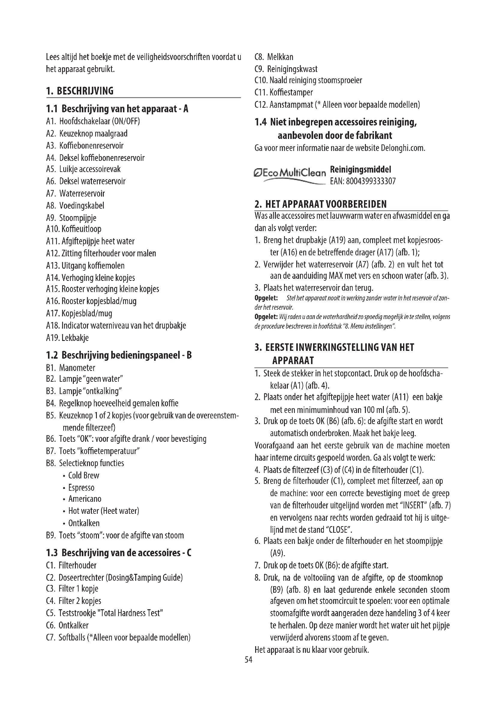 A1. Hoofdschakelaar (ON/OFF) A2. Keuzeknop maalgraad A3. Koebonenreservoir A4. Deksel koebonenreservoir A5. Luikje accessoirevak A6. Deksel waterreservoir A7. Waterreservoir A8. Voedingskabel A9. Stoompijpje A10. Koeuitloop A11. Afgiftepijpje heet water A12. Zitting lterhouder voor malen A13. Uitgang koemolen A14. Verhoging kleine kopjes A15. Rooster verhoging kleine kopjes A16. Rooster kopjesblad/mug A17. Kopjesblad/mug A18. Indicator waterniveau van het drupbakje A19. Lekbakje