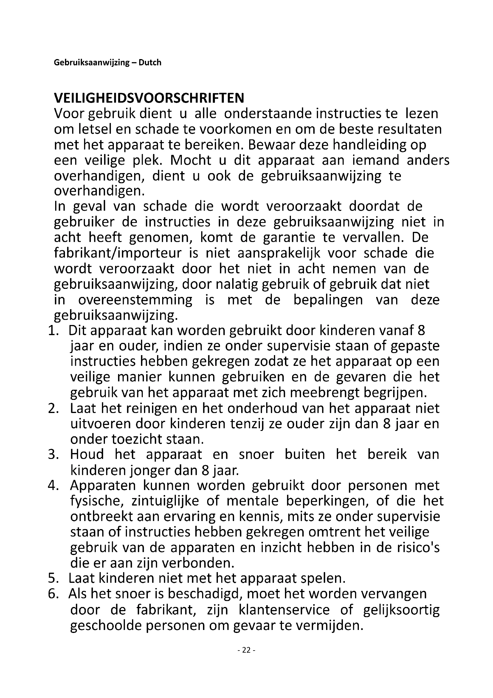 Recyclage – Directive européenne 2012/19/EU Ce symbole indique que le produit ne doit pas être jeté avec les ordures ménagères. Pour limiter les risques pour l’environnement et la santé entraînés par le rejet non contrôlé des déchets, recyclez ce dernier pour promouvoir une réutilisation responsable de ses matériaux. Pour recycler votre produit, utilisez les réseaux de collecte de votre région ou prenez contact avec le revendeur du produit. Ce dernier pourra vous aider à le recycler. Fabriqué par: Emerio B.V. Oudeweg 115, 2031 CC Haarlem, The Netherlands- 22 - Gebruiksaanwijzing – Dutch VEILIGHEIDSVOORSCHRIFTEN Voor gebruik dient u alle onderstaande instructies te lezen om letsel en schade te voorkomen en om de beste resultaten met het apparaat te bereiken. Bewaar deze handleiding op een veilige plek. Mocht u dit apparaat aan iemand anders overhandigen, dient u ook de gebruiksaanwijzing te overhandigen. In geval van schade die wordt veroorzaakt doordat de gebruiker de instructies in deze gebruiksaanwijzing niet in acht heeft genomen, komt de garantie te vervallen. De fabrikant/importeur is niet aansprakelijk voor schade die wordt veroorzaakt door het niet in acht nemen van de gebruiksaanwijzing, door nalatig gebruik of gebruik dat niet in overeenstemming is met de bepalingen van deze gebruiksaanwijzing.