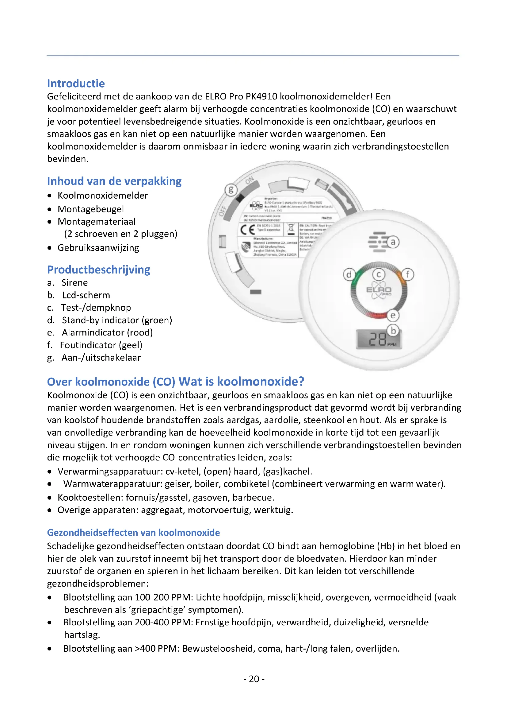 - Gebruiksaanwijzing Productbeschrijving a. Sirene b. Lcd-scherm c. Test-/dempknop d. Stand-by indicator (groen) e. Alarmindicator (rood) f. Foutindicator (geel) g. Aan-/uitschakelaar Over koolmonoxide (CO) Wat is koolmonoxide? Koolmonoxide (CO) is een onzichtbaar, geurloos en smaakloos gas en kan niet op een natuurlijke manier worden waargenomen. Het is een verbrandingsproduct dat gevormd wordt bij verbranding van koolstof houdende brandstoffen zoals aardgas, aardolie, steenkool en hout. Als er sprake is van onvolledige verbranding kan de hoeveelheid koolmonoxide in korte tijd tot een gevaarlijk niveau stijgen. In en rondom woningen kunnen zich verschillende verbrandingstoestellen bevinden die mogelijk tot verhoogde CO-concentraties leiden, zoals:
