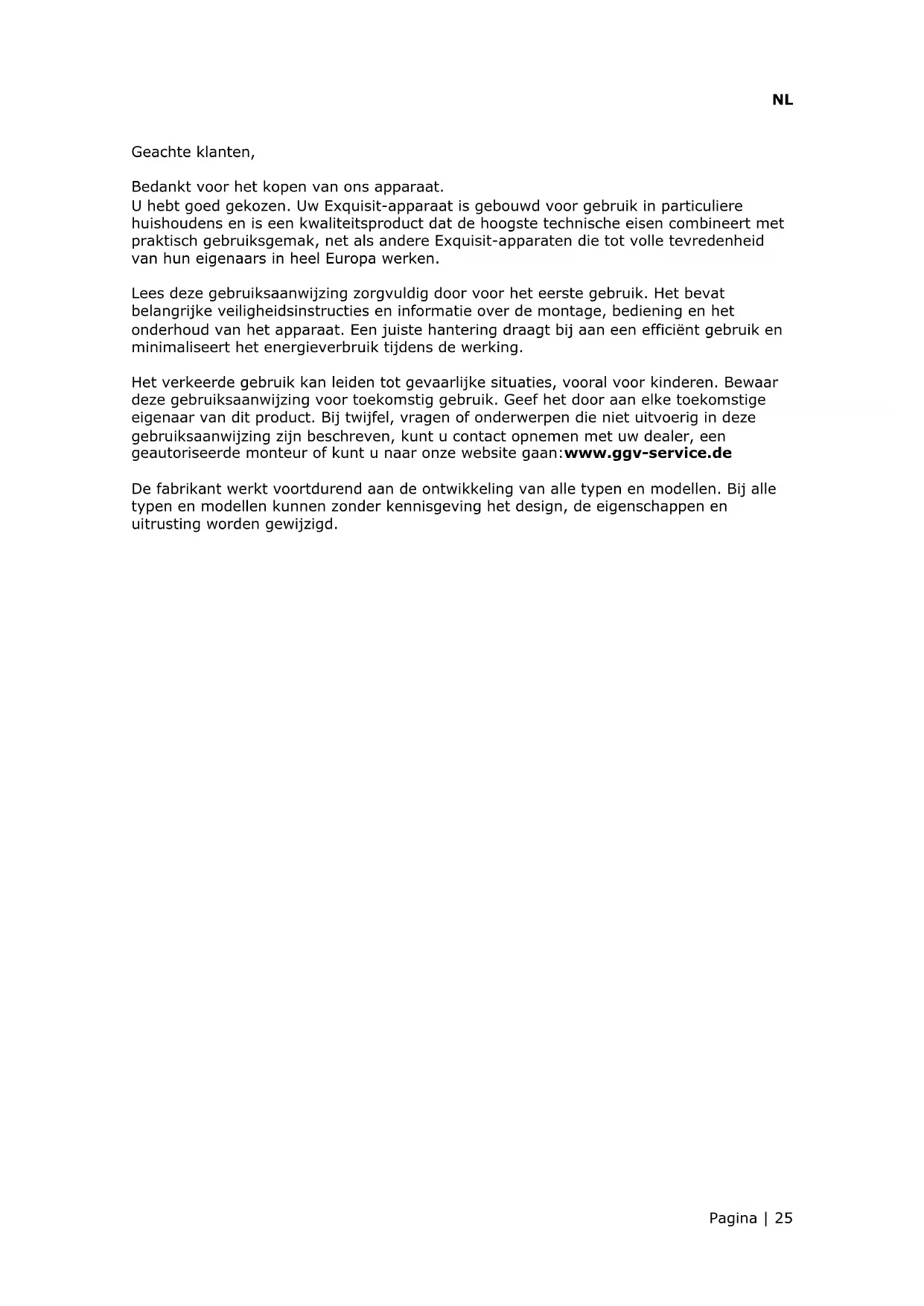 - Après réparation de l’appareil, les factures de réparation sont dues immédiatement et doivent être réglées sans déduction.NL Pagina | 25 Geachte klanten, Bedankt voor het kopen van ons apparaat. U hebt goed gekozen. Uw Exquisit-apparaat is gebouwd voor gebruik in particuliere huishoudens en is een kwaliteitsproduct dat de hoogste technische eisen combineert met praktisch gebruiksgemak, net als andere Exquisit-apparaten die tot volle tevredenheid van hun eigenaars in heel Europa werken. Lees deze gebruiksaanwijzing zorgvuldig door voor het eerste gebruik. Het bevat belangrijke veiligheidsinstructies en informatie over de montage, bediening en het onderhoud van het apparaat. Een juiste hantering draagt bij aan een efficiënt gebruik en minimaliseert het energieverbruik tijdens de werking. Het verkeerde gebruik kan leiden tot gevaarlijke situaties, vooral voor kinderen. Bewaar deze gebruiksaanwijzing voor toekomstig gebruik. Geef het door aan elke toekomstige eigenaar van dit product. Bij twijfel, vragen of onderwerpen die niet uitvoerig in deze gebruiksaanwijzing zijn beschreven, kunt u contact opnemen met uw dealer, een geautoriseerde monteur of kunt u naar onze website gaan:www.ggv-service.de De fabrikant werkt voortdurend aan de ontwikkeling van alle typen en modellen. Bij alle typen en modellen kunnen zonder kennisgeving het design, de eigenschappen en uitrusting worden gewijzigd.NL Pagina | 26 25 Veiligheid Alle veiligheidsaanwijzingen in deze gebruiksaanwijzing zijn gemarkeerd met een waarschuwingssymbool. Ze wijzen al vroeg op mogelijke gevaren. Het is essentieel om deze informatie te lezen en te volgen.