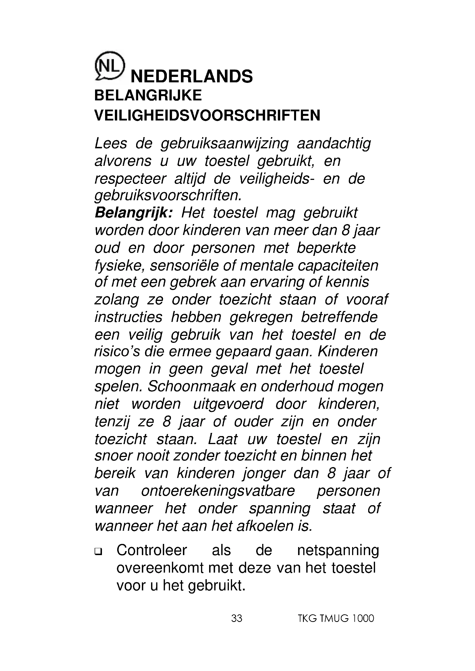 NEDERLANDS BELANGRIJKE VEILIGHEIDSVOORSCHRIFTEN Lees de gebruiksaanwijzing aandachtig alvorens u uw toestel gebruikt, en respecteer altijd de veiligheids- en de gebruiksvoorschriften. Belangrijk: Het toestel mag gebruikt worden door kinderen van meer dan 8 jaar oud en door personen met beperkte fysieke, sensoriële of mentale capaciteiten of met een gebrek aan ervaring of kennis zolang ze onder toezicht staan of vooraf instructies hebben gekregen betreffende een veilig gebruik van het toestel en de risico’s die ermee gepaard gaan. Kinderen mogen in geen geval met het toestel spelen. Schoonmaak en onderhoud mogen niet worden uitgevoerd door kinderen, tenzij ze 8 jaar of ouder zijn en onder toezicht staan. Laat uw toestel en zijn snoer nooit zonder toezicht en binnen het bereik van kinderen jonger dan 8 jaar of van ontoerekeningsvatbare personen wanneer het onder spanning staat of wanneer het aan het afkoelen is. ❑ Controleer als de netspanning overeenkomt met deze van het toestel voor u het gebruikt.TKG TMUG 1000