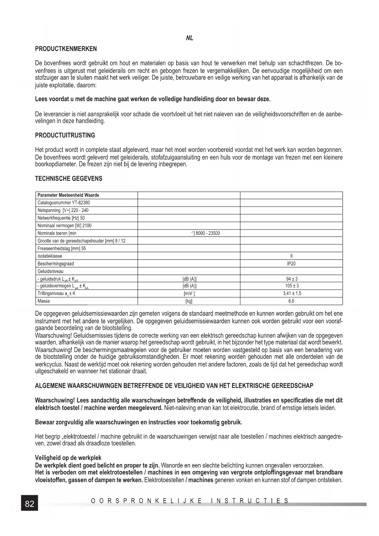OORSPRONKELIJKE INSTRUCTIES PRODUCTKENMERKEN De bovenfrees wordt gebruikt om hout en materialen op basis van hout te verwerken met behulp van schachtfrezen. De bo- venfrees is uitgerust met geleiderails om recht en gebogen frezen te vergemakkelijken. De eenvoudige mogelijkheid om een stofzuiger aan te sluiten maakt het werk veiliger. De juiste, betrouwbare en veilige werking van het apparaat is afhankelijk van de juiste exploitatie, daarom: Lees voordat u met de machine gaat werken de volledige handleiding door en bewaar deze. De leverancier is niet aansprakelijk voor schade die voortvloeit uit het niet naleven van de veiligheidsvoorschriften en de aanbe- velingen in deze handleiding. PRODUCTUITRUSTING Het product wordt in complete staat afgeleverd, maar het moet worden voorbereid voordat met het werk kan worden begonnen. De bovenfrees wordt geleverd met geleiderails, stofafzuigaansluiting en een huls voor de montage van frezen met een kleinere boorkopdiameter. De frezen zijn niet bij de levering inbegrepen. TECHNISCHE GEGEVENS Parameter Meeteenheid Waarde Catalogusnummer YT-82380 Netspanning [V~] 220 - 240 Netwerkfrequentie [Hz] 50 Nominaal vermogen [W] 2100 Nominale toeren [min