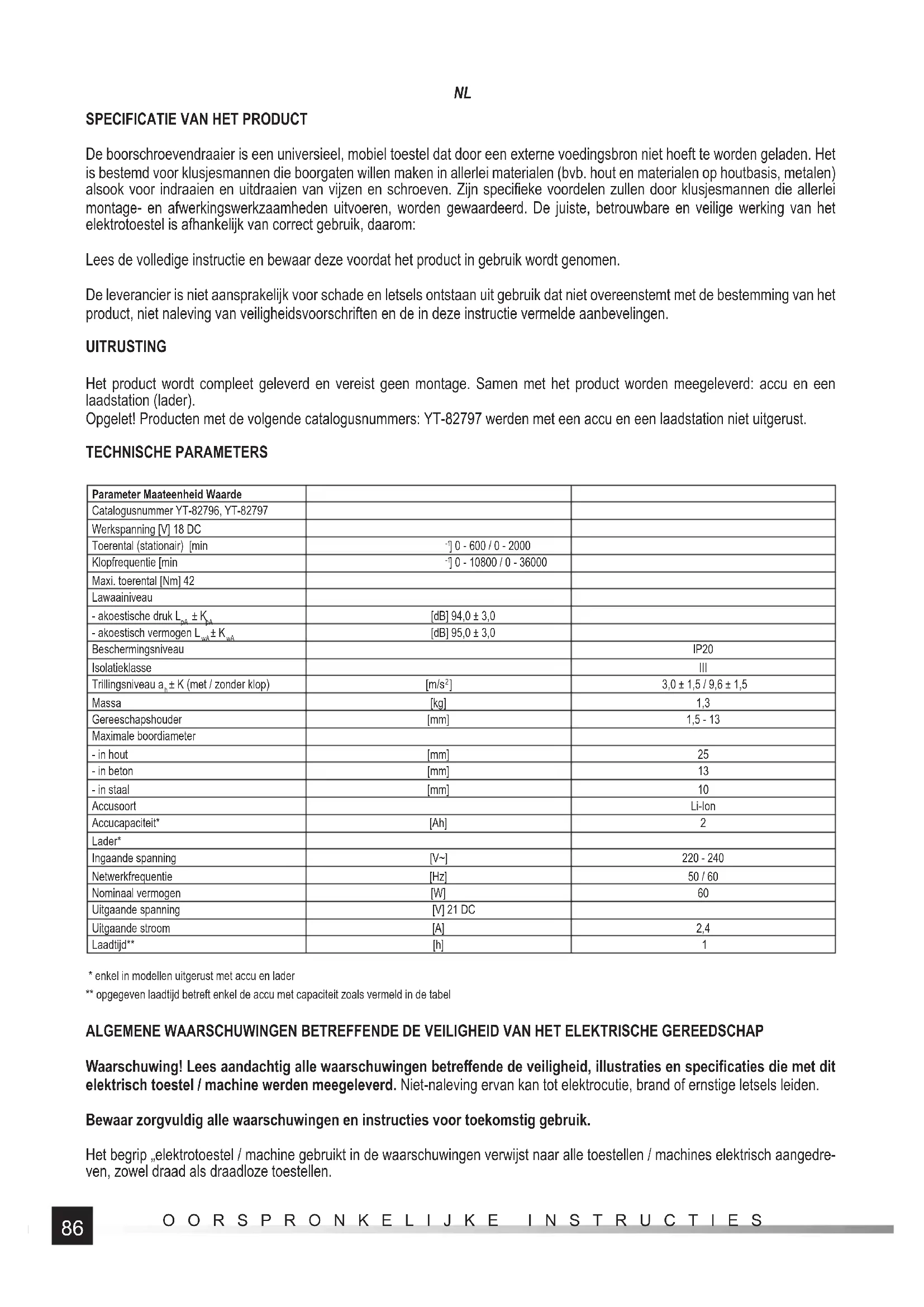 - enkel in modellen uitgerust met accu en lader ** opgegeven laadtijd betreft enkel de accu met capaciteit zoals vermeld in de tabel ALGEMENE WAARSCHUWINGEN BETREFFENDE DE VEILIGHEID VAN HET ELEKTRISCHE GEREEDSCHAP Waarschuwing! Lees aandachtig alle waarschuwingen betreff ende de veiligheid, illustraties en specifi caties die met dit elektrisch toestel / machine werden meegeleverd. Niet-naleving ervan kan tot elektrocutie, brand of ernstige letsels leiden. Bewaar zorgvuldig alle waarschuwingen en instructies voor toekomstig gebruik. Het begrip „elektrotoestel / machine gebruikt in de waarschuwingen verwijst naar alle toestellen / machines elektrisch aangedre- ven, zowel draad als draadloze toestellen.87 OORSPRONKELIJKE INSTRUCTIES