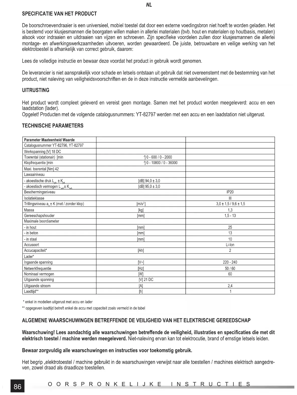 - enkel in modellen uitgerust met accu en lader ** opgegeven laadtijd betreft enkel de accu met capaciteit zoals vermeld in de tabel ALGEMENE WAARSCHUWINGEN BETREFFENDE DE VEILIGHEID VAN HET ELEKTRISCHE GEREEDSCHAP Waarschuwing! Lees aandachtig alle waarschuwingen betreff ende de veiligheid, illustraties en specifi caties die met dit elektrisch toestel / machine werden meegeleverd. Niet-naleving ervan kan tot elektrocutie, brand of ernstige letsels leiden. Bewaar zorgvuldig alle waarschuwingen en instructies voor toekomstig gebruik. Het begrip „elektrotoestel / machine gebruikt in de waarschuwingen verwijst naar alle toestellen / machines elektrisch aangedre- ven, zowel draad als draadloze toestellen.87 OORSPRONKELIJKE INSTRUCTIES