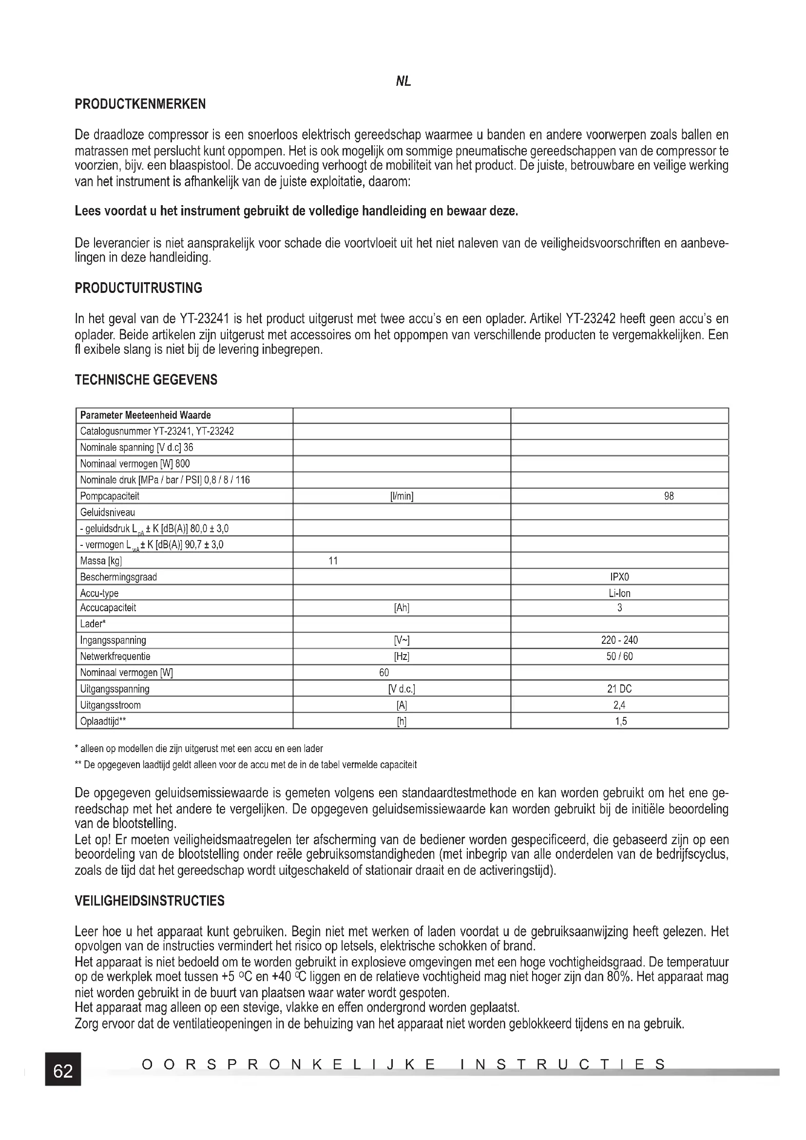 PRODUCTKENMERKEN De draadloze compressor is een snoerloos elektrisch gereedschap waarmee u banden en andere voorwerpen zoals ballen en matrassen met perslucht kunt oppompen. Het is ook mogelijk om sommige pneumatische gereedschappen van de compressor te voorzien, bijv. een blaaspistool. De accuvoeding verhoogt de mobiliteit van het product. De juiste, betrouwbare en veilige werking van het instrument is afhankelijk van de juiste exploitatie, daarom: Lees voordat u het instrument gebruikt de volledige handleiding en bewaar deze. De leverancier is niet aansprakelijk voor schade die voortvloeit uit het niet naleven van de veiligheidsvoorschriften en aanbeve- lingen in deze handleiding. PRODUCTUITRUSTING In het geval van de YT-23241 is het product uitgerust met twee accu’s en een oplader. Artikel YT-23242 heeft geen accu’s en oplader. Beide artikelen zijn uitgerust met accessoires om het oppompen van verschillende producten te vergemakkelijken. Een fl exibele slang is niet bij de levering inbegrepen. TECHNISCHE GEGEVENS Parameter Meeteenheid Waarde Catalogusnummer YT-23241, YT-23242 Nominale spanning [V d.c] 36 Nominaal vermogen [W] 800 Nominale druk [MPa / bar / PSI] 0,8 / 8 / 116 Pompcapaciteit [l/min] 98 Geluidsniveau - geluidsdruk L